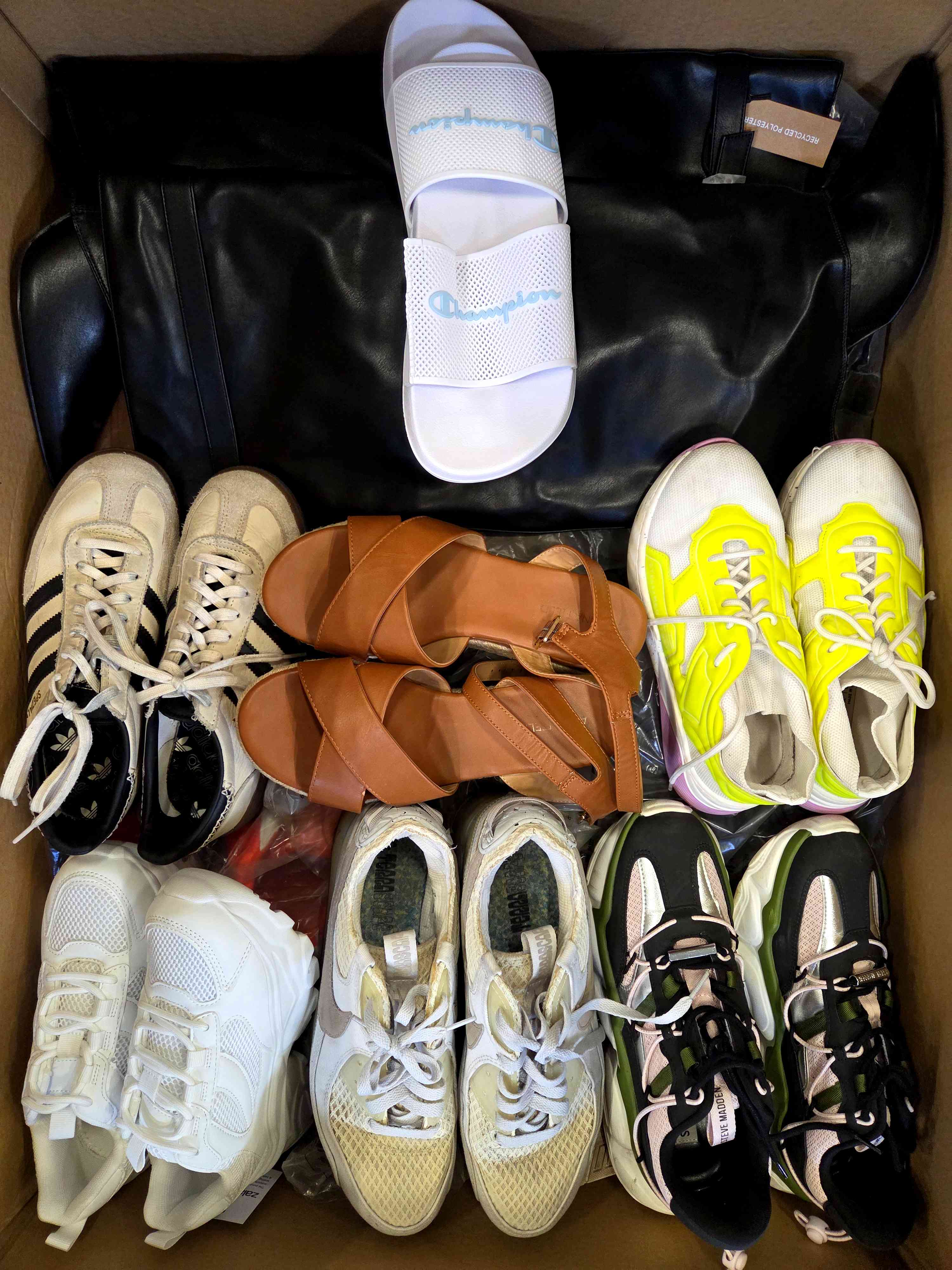 Footwear has visible signs of use or defects (broken mesh, dislodged sole, dings, broken zipper, torn heel counter, cuts, cracks in the material, missing insole, discoloration, missing laces, etc.). Part of defects may be unrepairable. Top brands selected for the photo. Footwear does not have original packaging and is mostly packed in transparent bags. Both winter and summer models may occur.