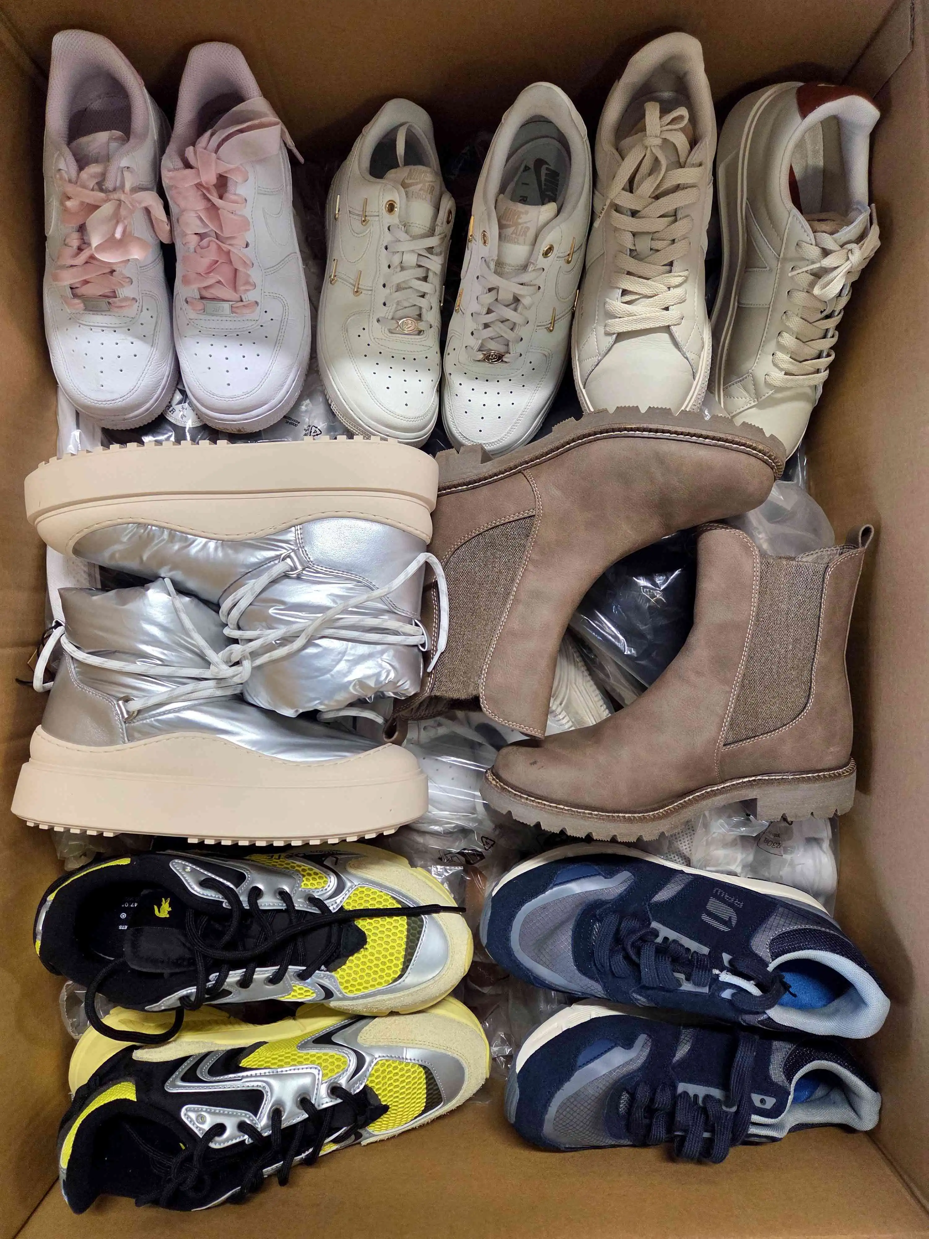 Footwear has visible signs of use or defects (broken mesh, dislodged sole, dings, broken zipper, torn heel counter, cuts, cracks in the material, missing insole, discoloration, missing laces, etc.). Part of defects may be unrepairable. Top brands selected for the photo. Footwear does not have original packaging and is mostly packed in transparent bags. Both winter and summer models may occur.
