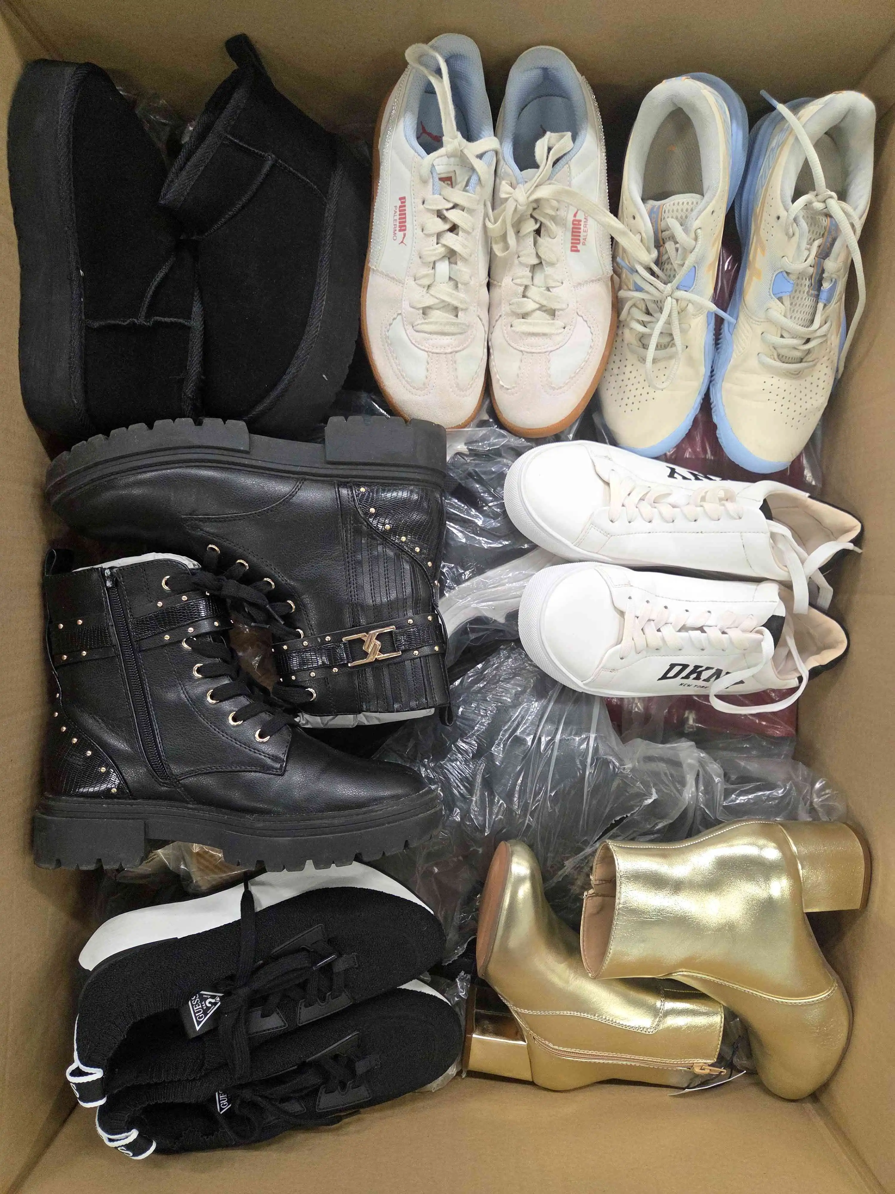 Footwear has visible signs of use or defects (broken mesh, dislodged sole, dings, broken zipper, torn heel counter, cuts, cracks in the material, missing insole, discoloration, missing laces, etc.). Part of defects may be unrepairable. Top brands selected for the photo. Footwear does not have original packaging and is mostly packed in transparent bags. Both winter and summer models may occur.