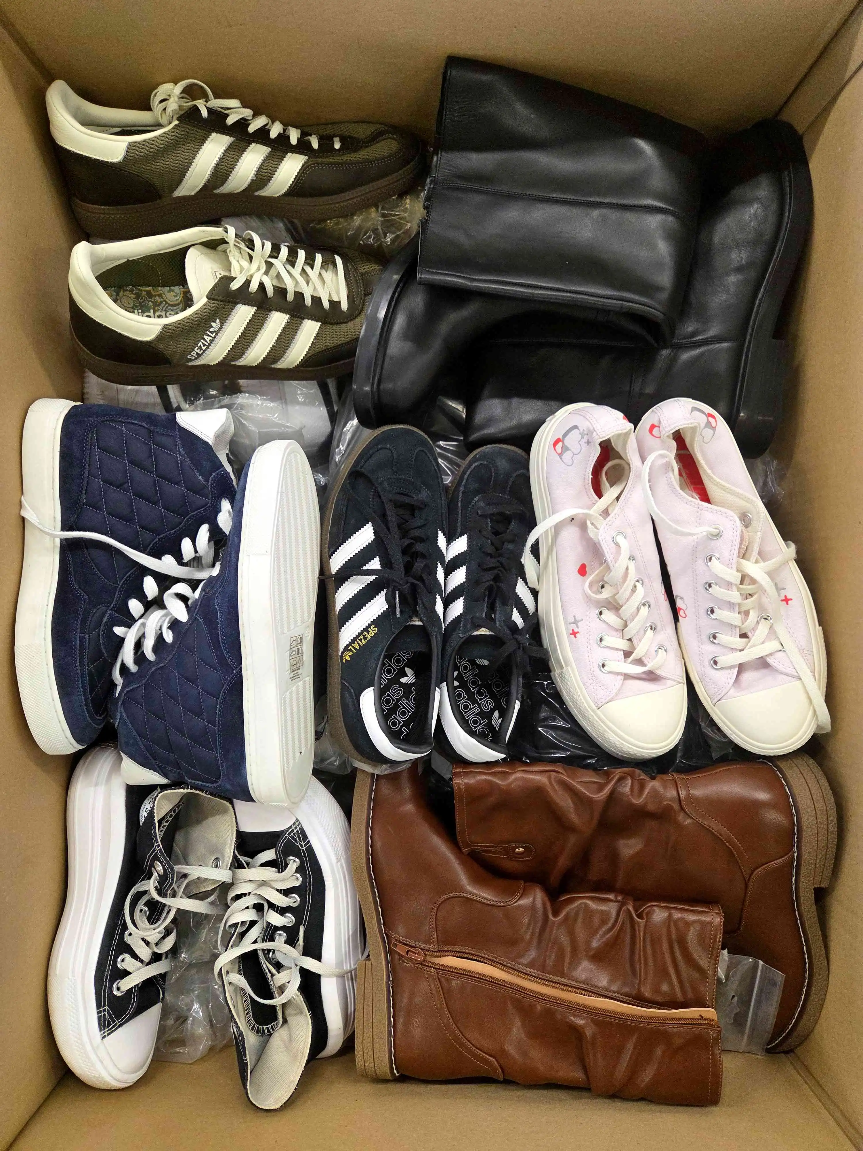 Footwear has visible signs of use or defects (broken mesh, dislodged sole, dings, broken zipper, torn heel counter, cuts, cracks in the material, missing insole, discoloration, missing laces, etc.). Part of defects may be unrepairable. Top brands selected for the photo. Footwear does not have original packaging and is mostly packed in transparent bags. Both winter and summer models may occur.