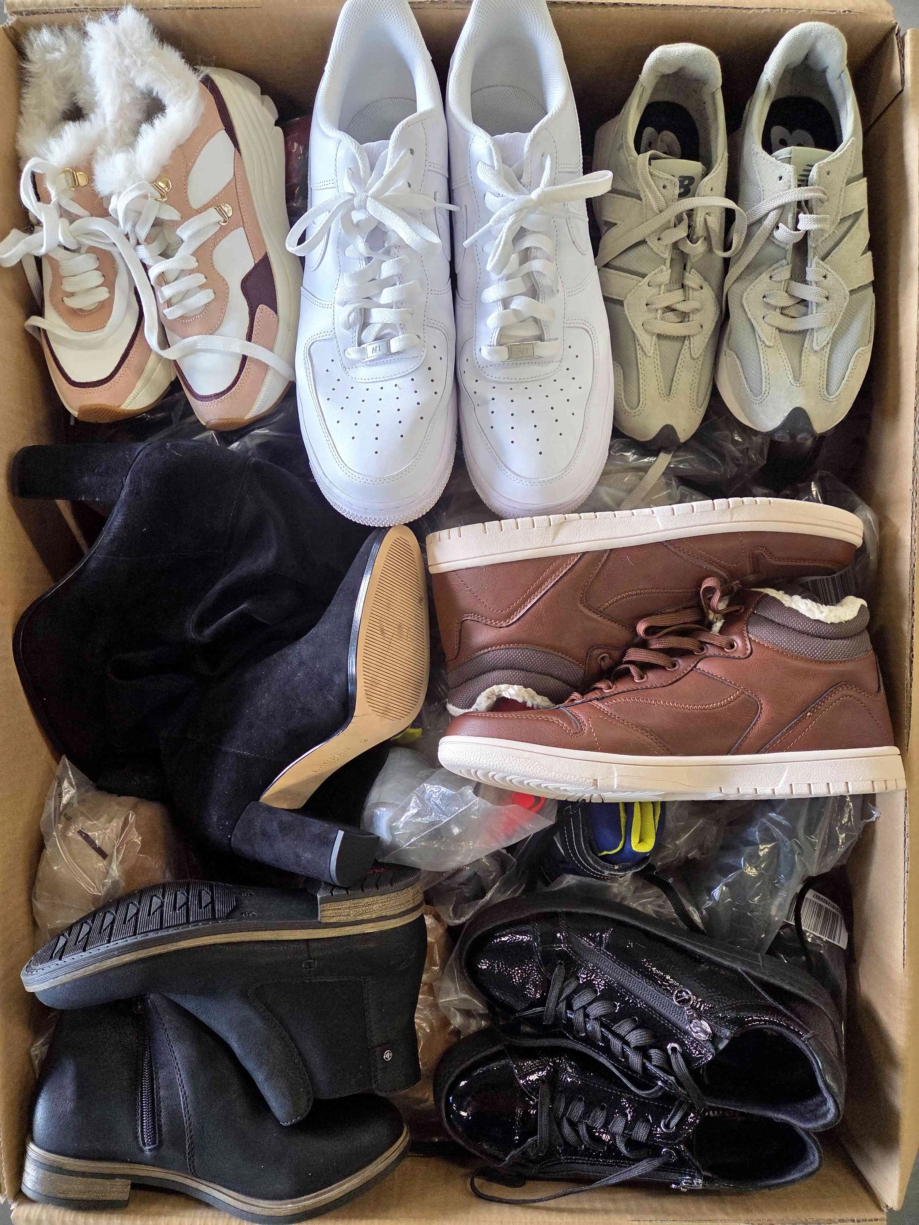 Footwear has visible signs of use or defects (broken mesh, dislodged sole, dings, broken zipper, torn heel counter, cuts, cracks in the material, missing insole, discoloration, missing laces, etc.). Part of defects may be unrepairable. Top brands selected for the photo. Footwear does not have original packaging and is mostly packed in transparent bags. Both winter and summer models may occur.