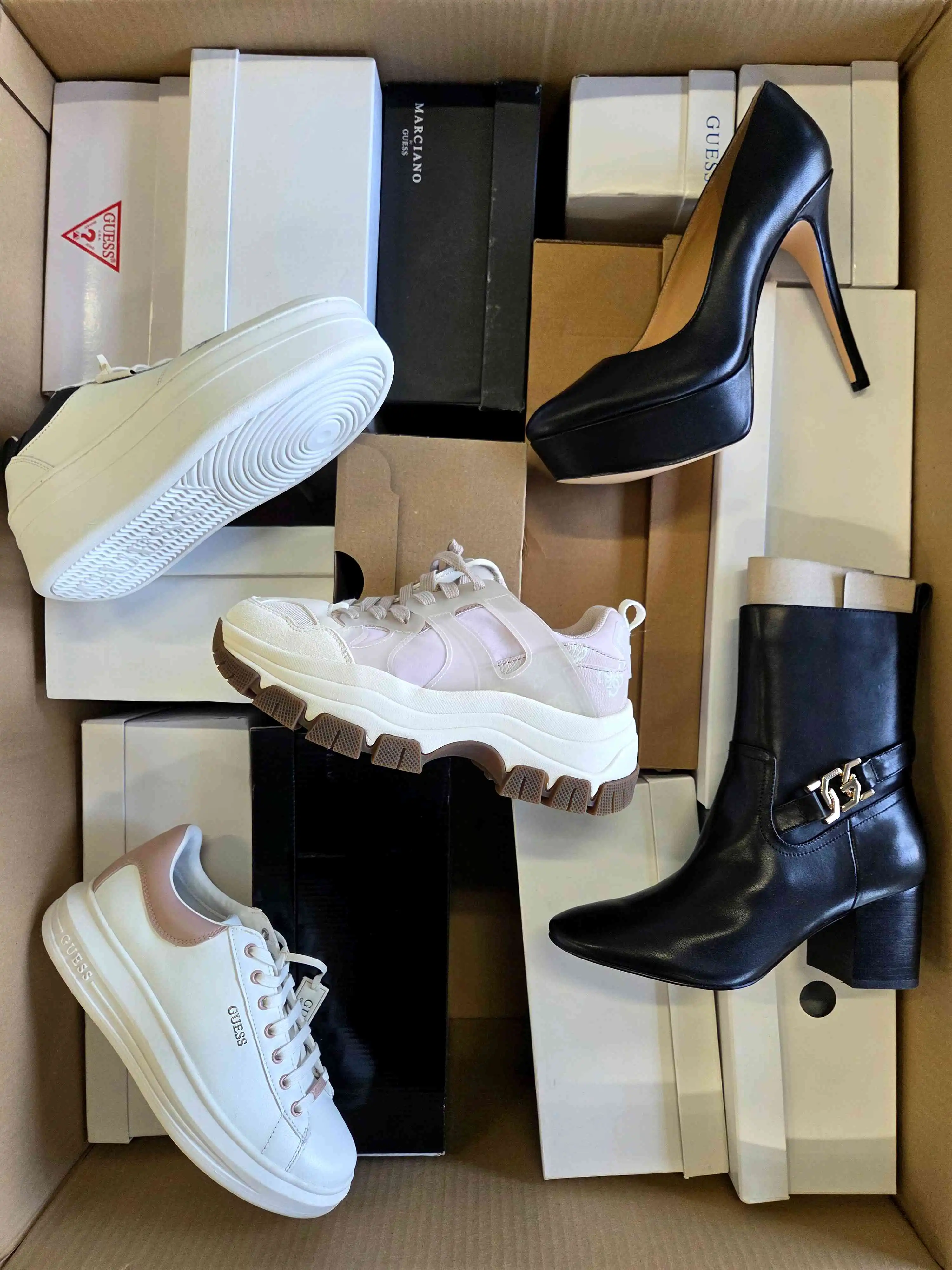 The product shows minimal, reversible signs of use (slight dirt) or small manufacturer defects. The shoes are packed in original or replacement boxes. The package includes 100% genuine footwear, not divided by seasonality — it may contain both winter and summer models. The assortment can include men’s, women’s, and children’s shoes.