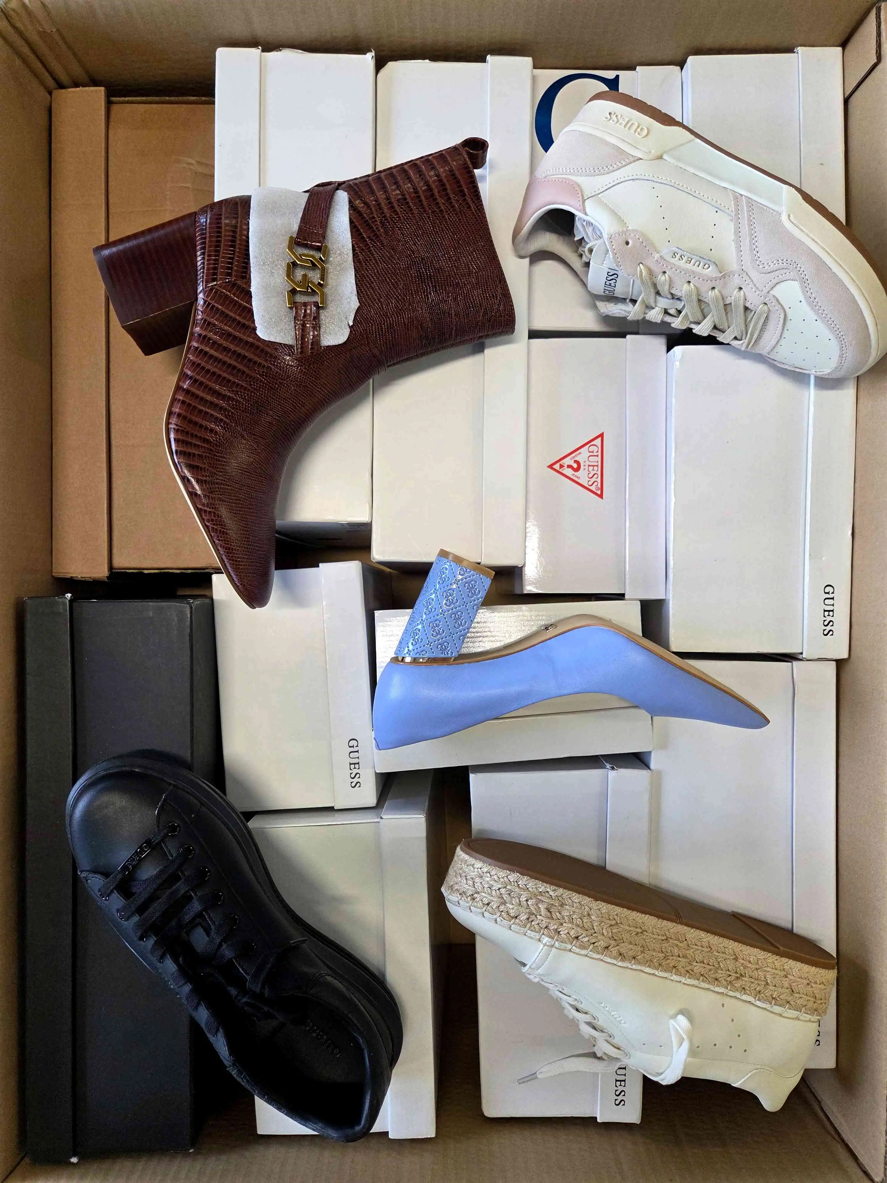 The product shows minimal, reversible signs of use (slight dirt) or small manufacturer defects. The shoes are packed in original or replacement boxes. The package includes 100% genuine footwear, not divided by seasonality — it may contain both winter and summer models. The assortment can include men’s, women’s, and children’s shoes.