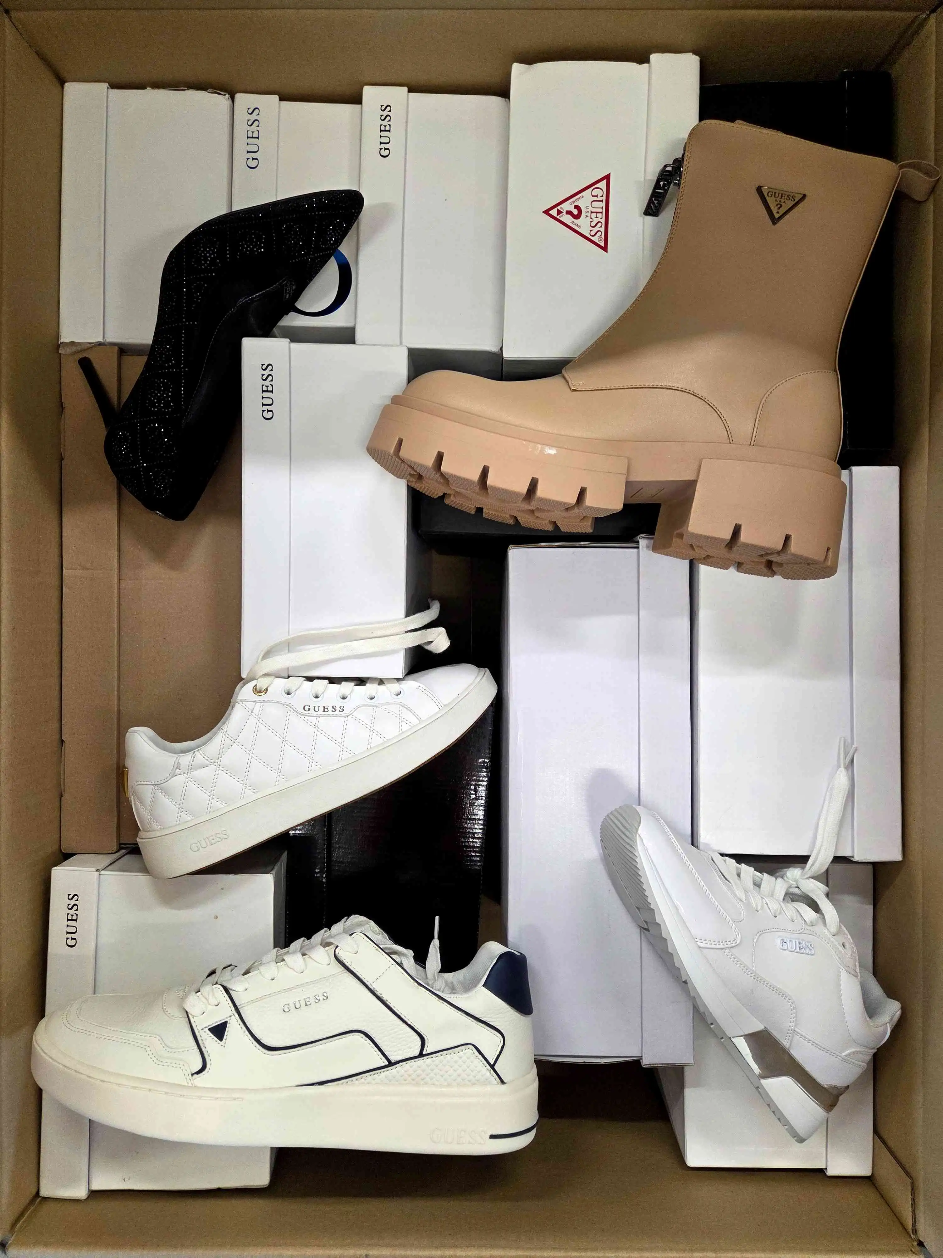 The product shows minimal, reversible signs of use (slight dirt) or small manufacturer defects. The shoes are packed in original or replacement boxes. The package includes 100% genuine footwear, not divided by seasonality — it may contain both winter and summer models. The assortment can include men’s, women’s, and children’s shoes.