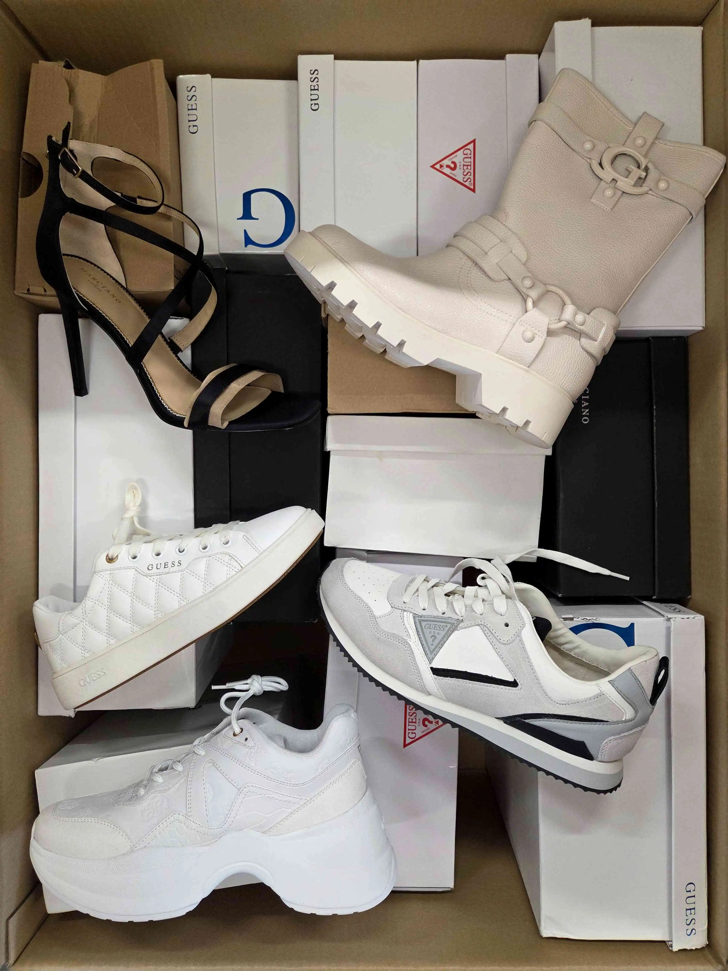 The product shows minimal, reversible signs of use (slight dirt) or small manufacturer defects. The shoes are packed in original or replacement boxes. The package includes 100% genuine footwear, not divided by seasonality — it may contain both winter and summer models. The assortment can include men’s, women’s, and children’s shoes.