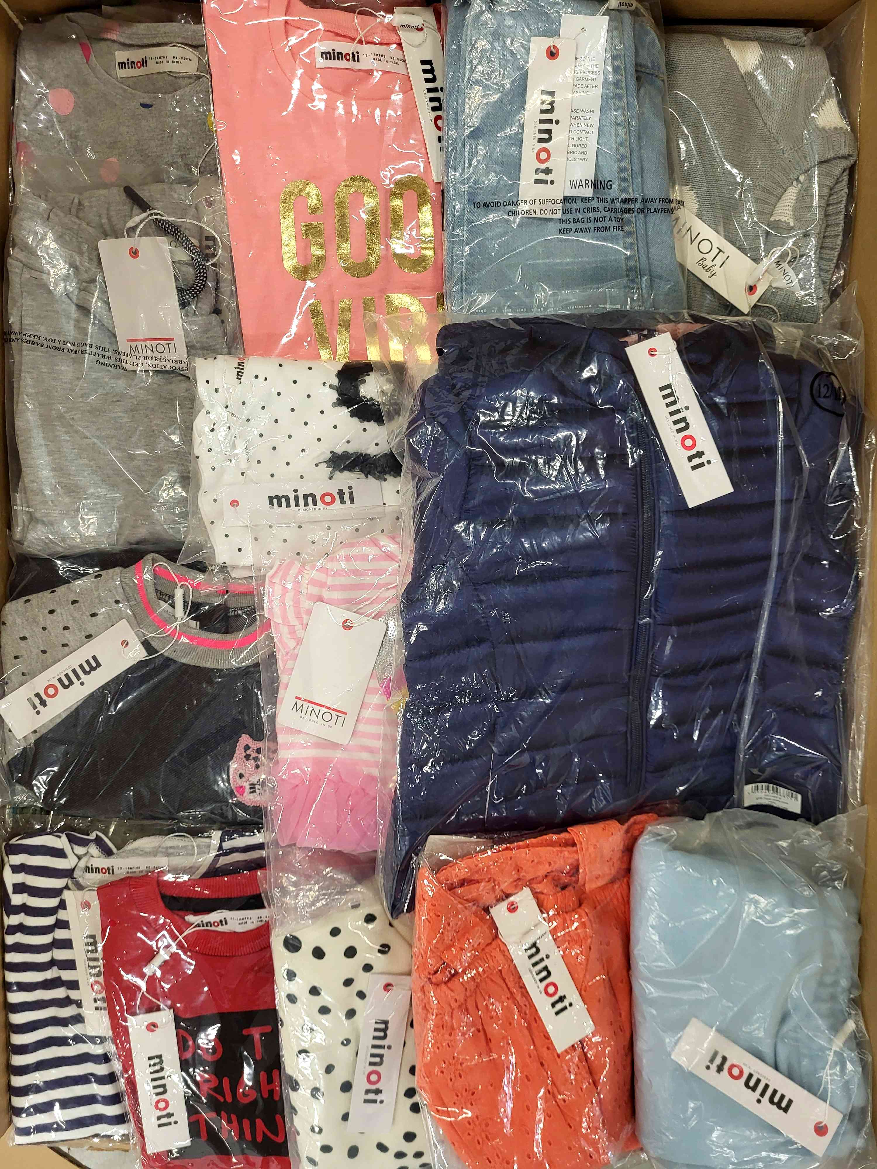 The Minoti children’s clothing bundle includes approximately 100 pieces of new, original garments designed for children aged 3 months to 14 years.