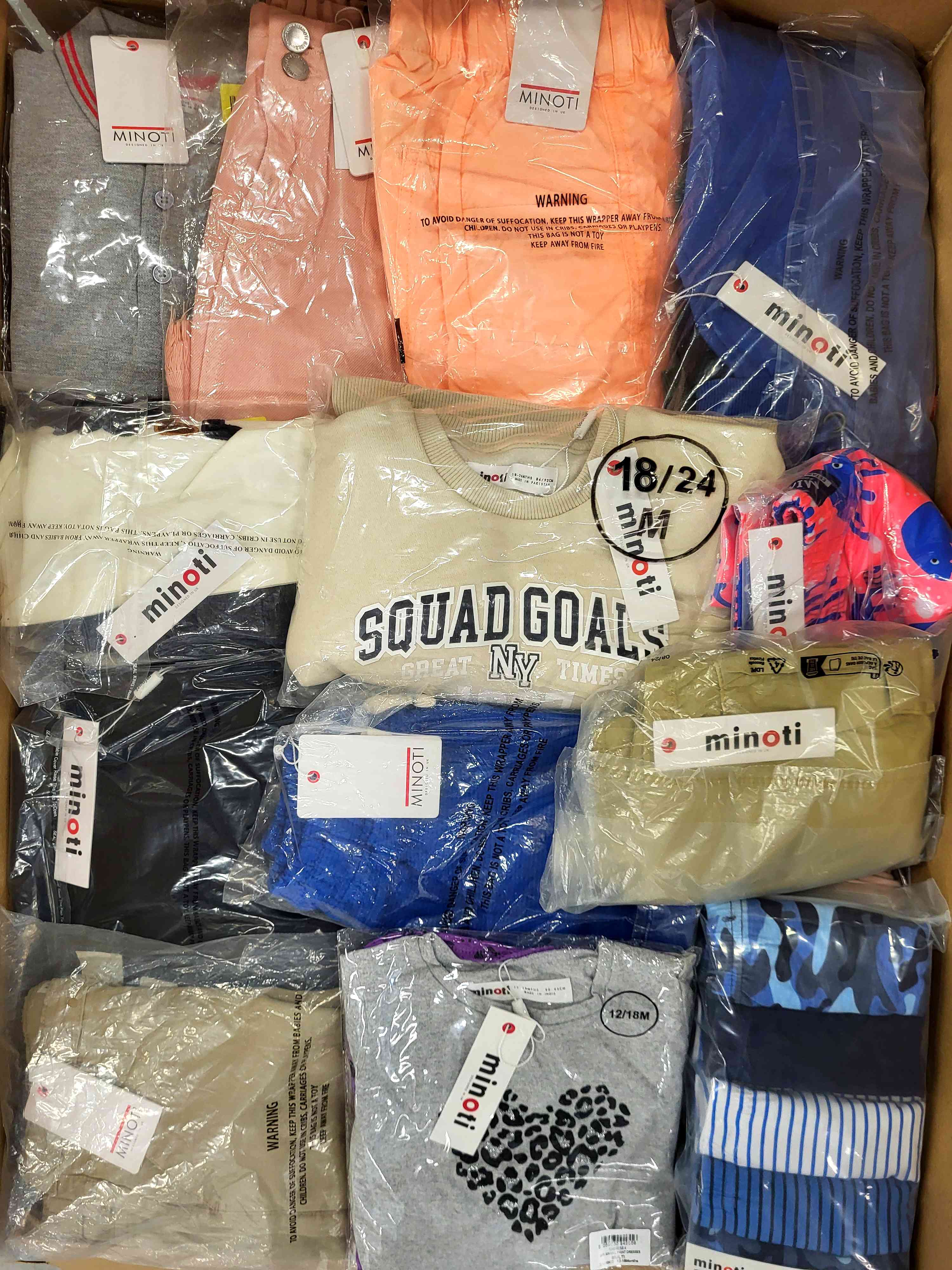 The Minoti children’s clothing bundle includes approximately 100 pieces of new, original garments designed for children aged 3 months to 14 years.