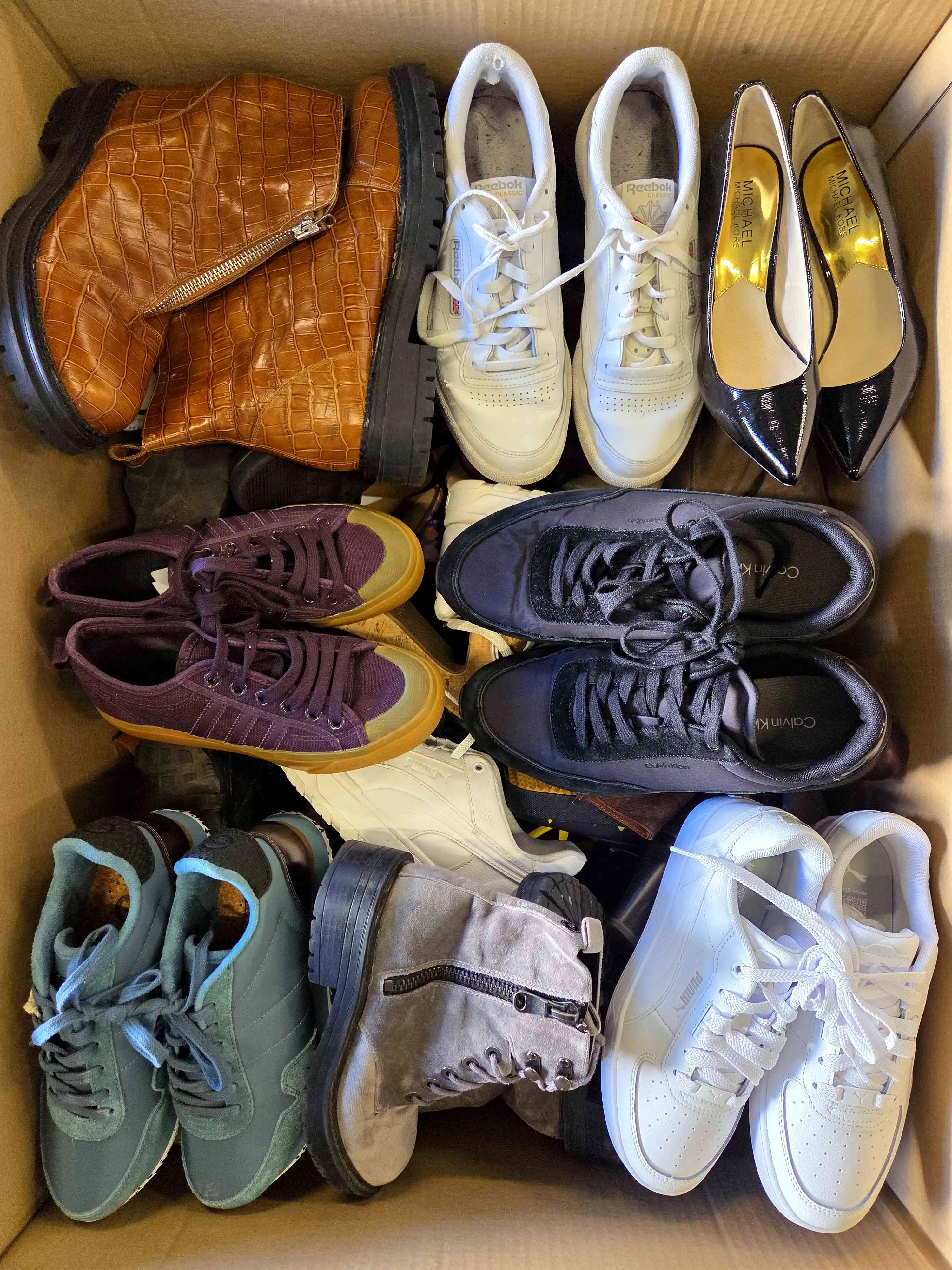 Used footwear packages. The package includes about 30 pairs of shoes (summer shoes, winter shoes, sports shoes, men’s shoes, women’s shoes, children’s shoes).