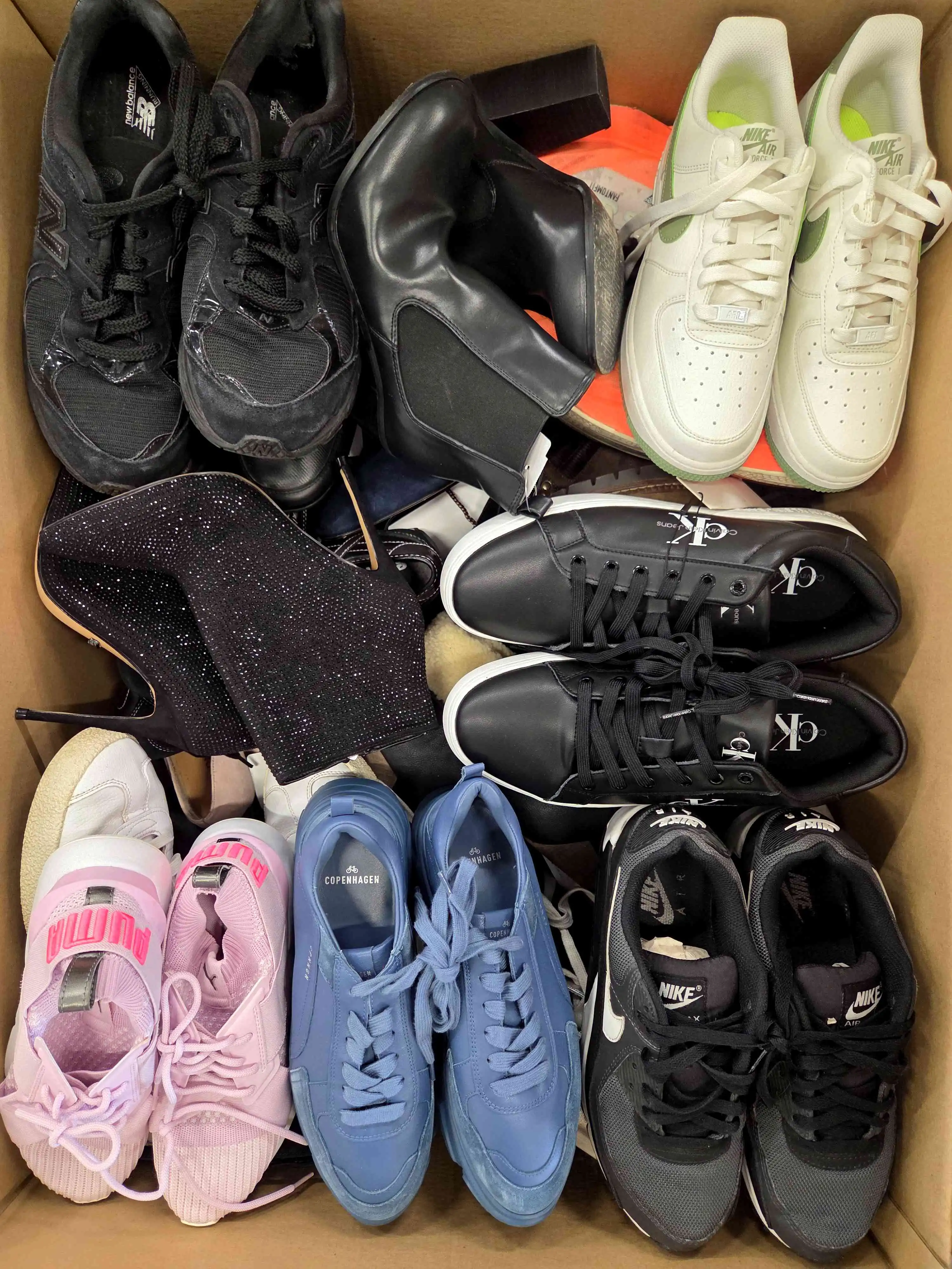 The footwear has visible signs of use and defects (cracked mesh, dislodged sole, dings, broken zipper, torn heel counter, cuts, material cracks, missing insole, discoloration, missing laces, bad sizing etc.).