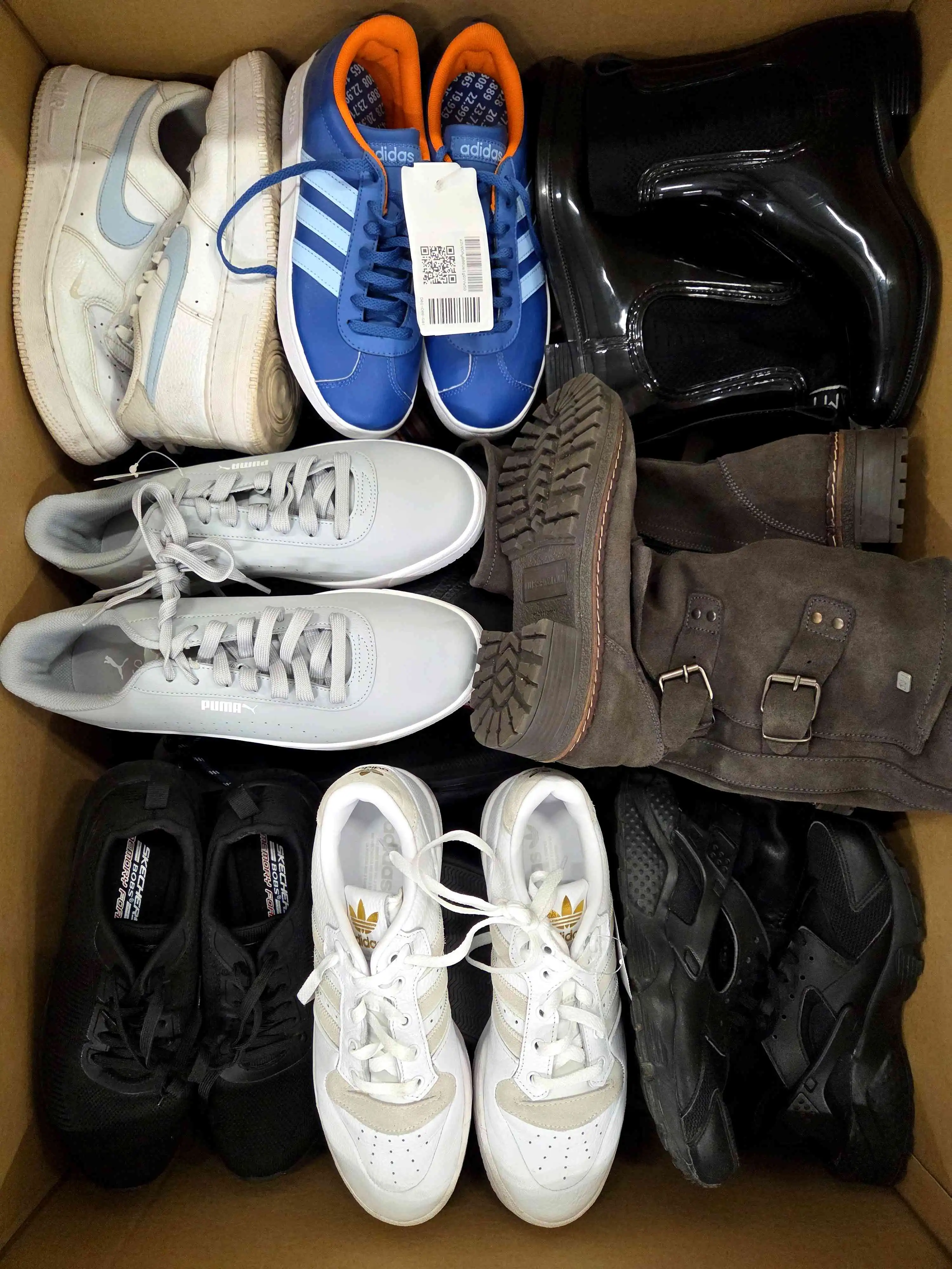 Used footwear packages. The package includes about 30 pairs of shoes (summer shoes, winter shoes, sports shoes, men’s shoes, women’s shoes, children’s shoes).