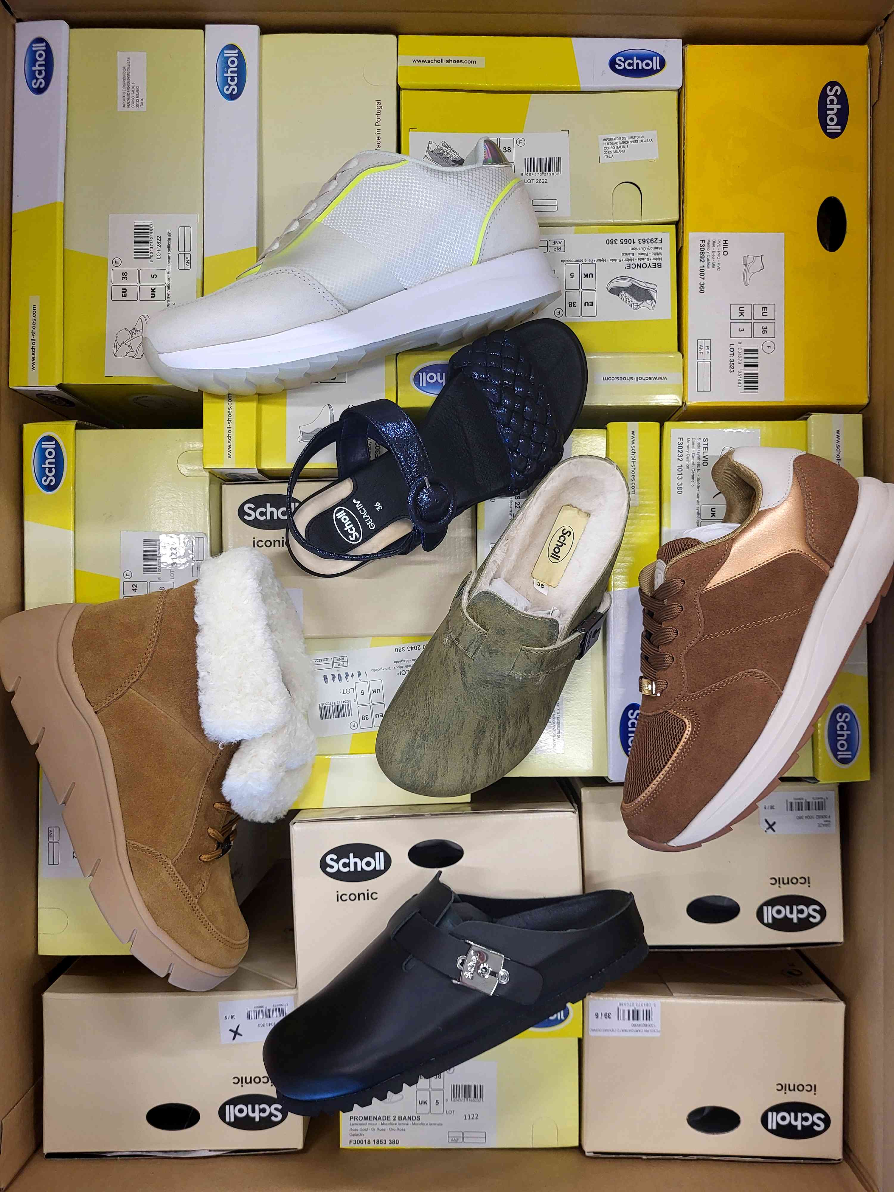 The package contains a variety of women’s footwear suitable for all seasons. It includes autumn and winter boots, sneakers, slides, and sandals. Models are repeated but come in different color variations, making the offer more attractive.