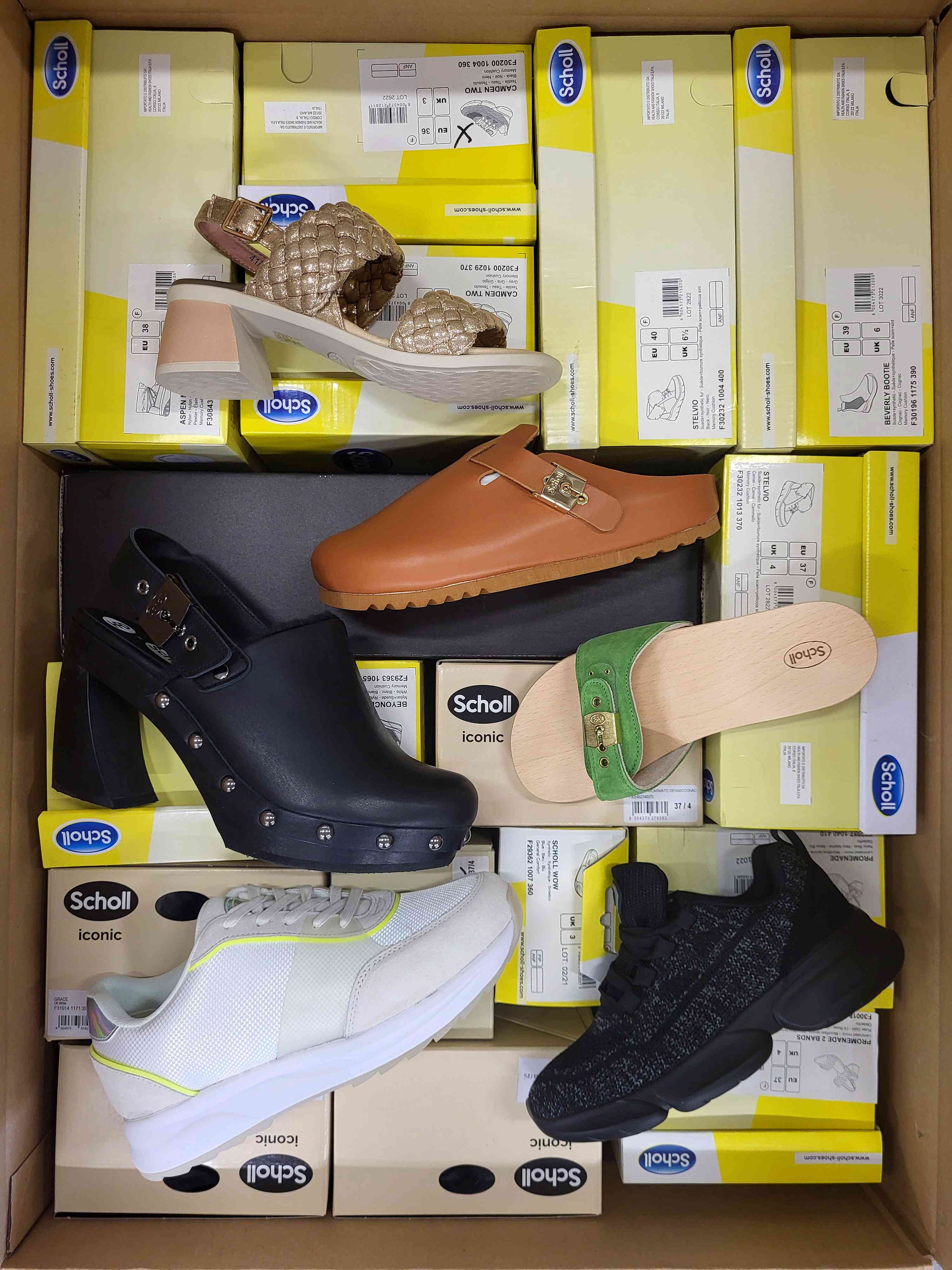 The package contains a variety of women’s footwear suitable for all seasons. It includes autumn and winter boots, sneakers, slides, and sandals. Models are repeated but come in different color variations, making the offer more attractive.