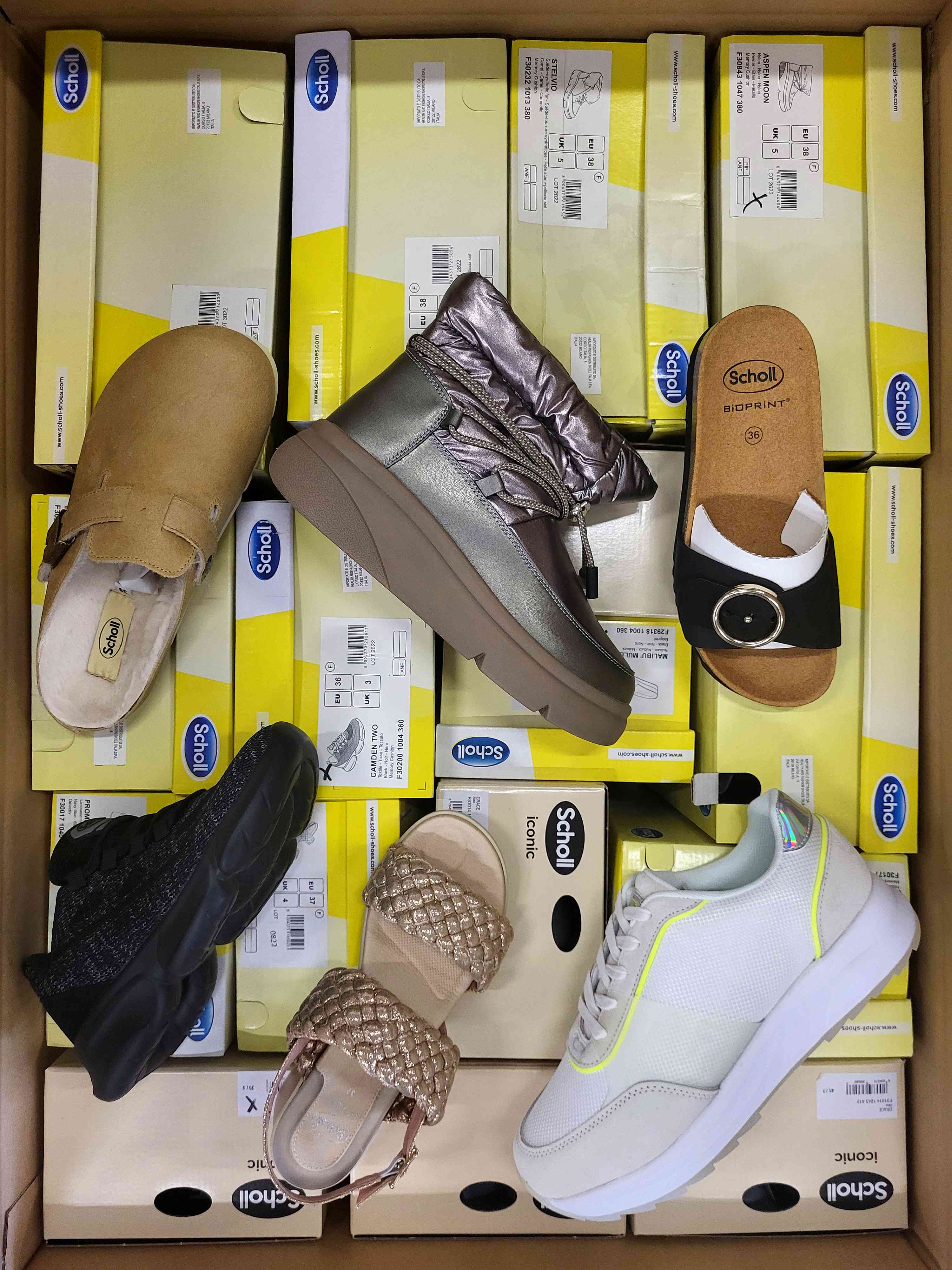 The package contains a variety of women’s footwear suitable for all seasons. It includes autumn and winter boots, sneakers, slides, and sandals. Models are repeated but come in different color variations, making the offer more attractive.