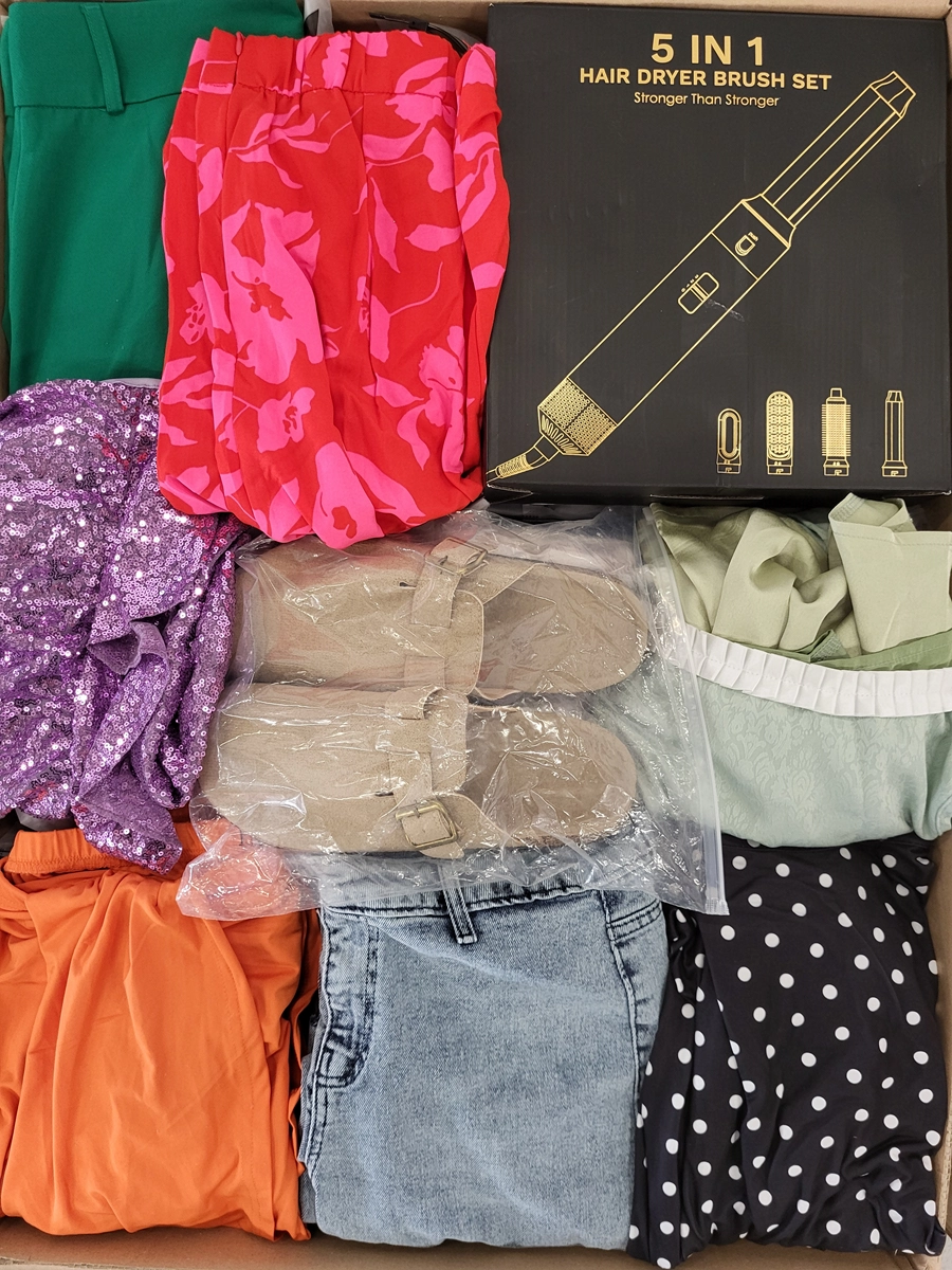 The package may contain: Clothing, footwear and accessories, including jackets, sweatshirts, shoes, gloves, handbags, etc.