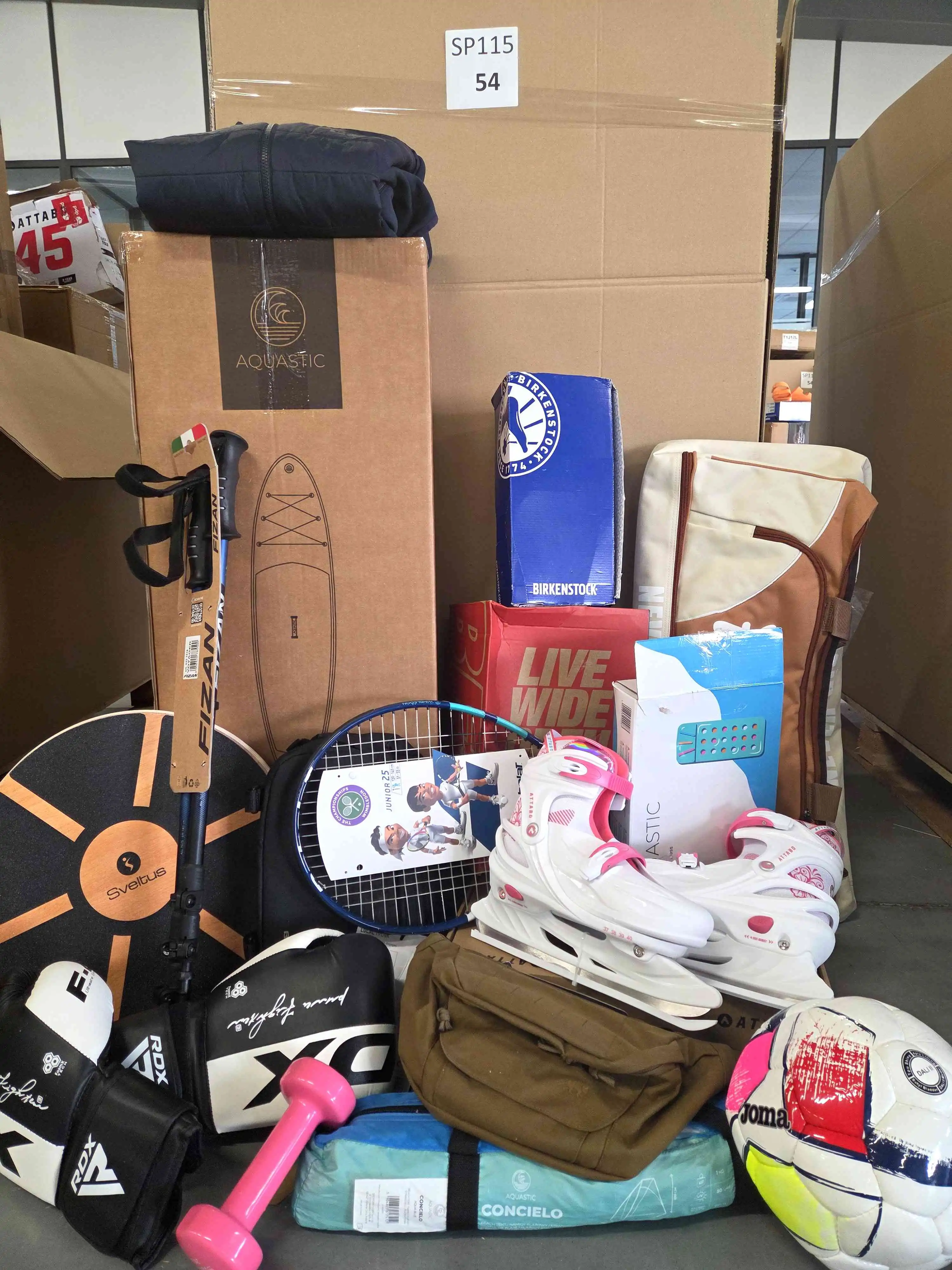 The pallet includes a wide range of sports accessories and equipment, such as: SUP