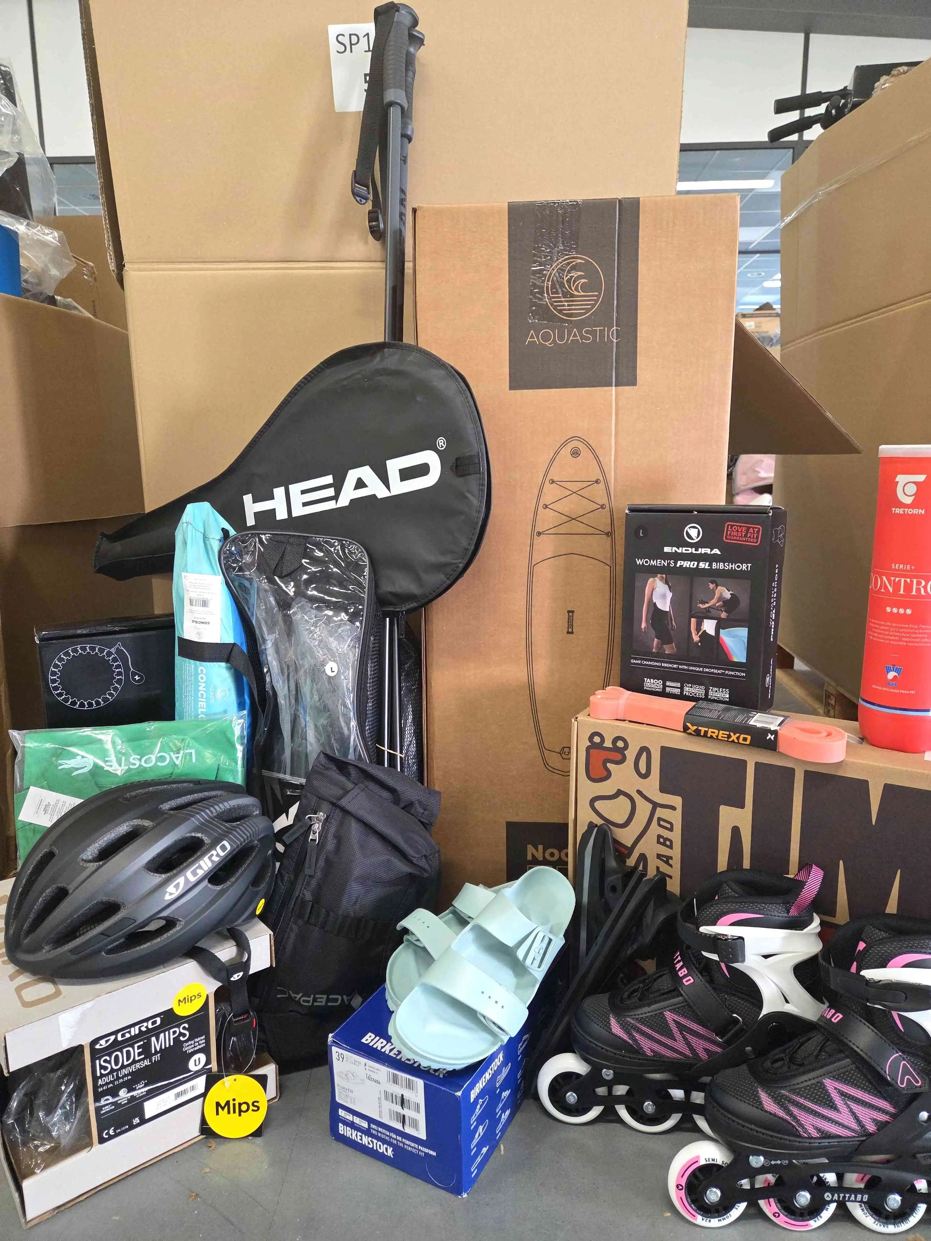 The pallet includes a wide range of sports accessories and equipment, such as: SUP
