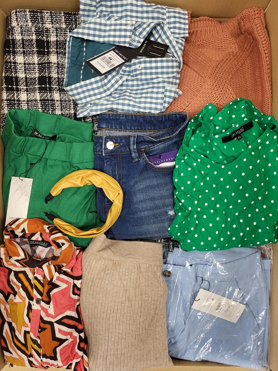Category C package with significant signs of use or defects. The top layer shown is the contents of this package. The package contains approximately 75 pieces of which 80% are women’s clothing, 7% men’s clothing, 13% children’s clothing and accessories