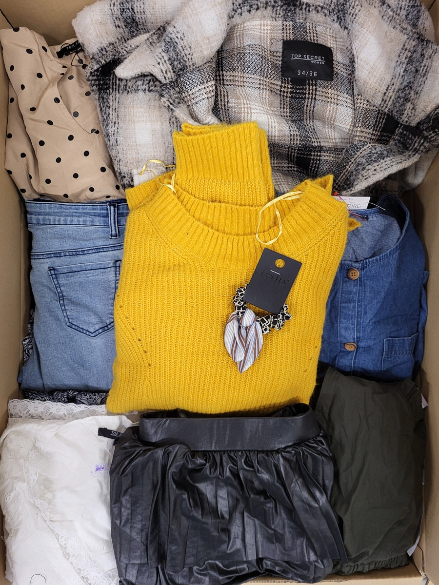 Category C package with significant signs of use or defects. The top layer shown is the contents of this package. The package contains approximately 75 pieces of which 80% are women’s clothing, 7% men’s clothing, 13% children’s clothing and accessories