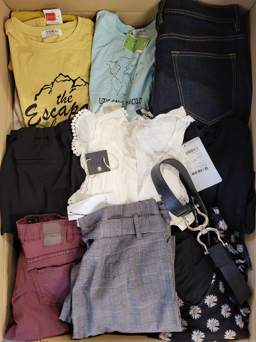 Category C package with significant signs of use or defects. The top layer shown is the contents of this package. The package contains approximately 75 pieces of which 80% are women’s clothing, 7% men’s clothing, 13% children’s clothing and accessories