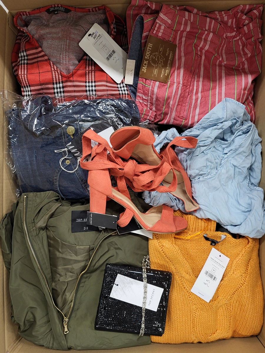 The package may include: shoes, handbags, jackets, jewelry, watches, tracksuits, jeans, shirts, dresses, etc.