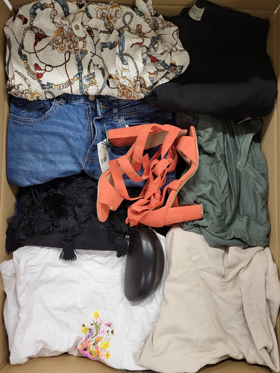 Category C package with significant signs of use or defects. The top layer shown is the contents of this package. The package contains approximately 75 pieces of which 80% are women’s clothing, 7% men’s clothing, 13% children’s clothing and accessories