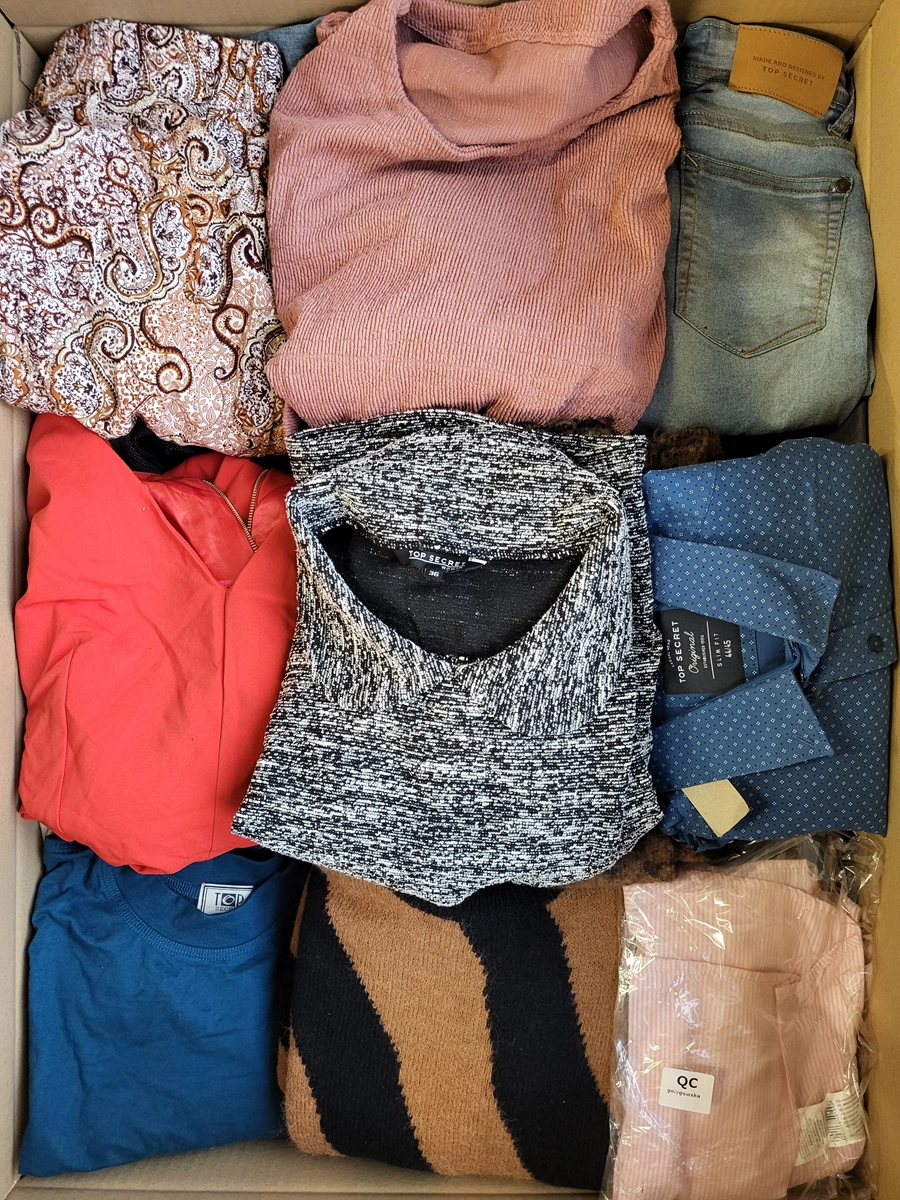 Category C package with significant signs of use or defects. The top layer shown is the contents of this package. The package contains approximately 75 pieces of which 80% are women’s clothing, 7% men’s clothing, 13% children’s clothing and accessories