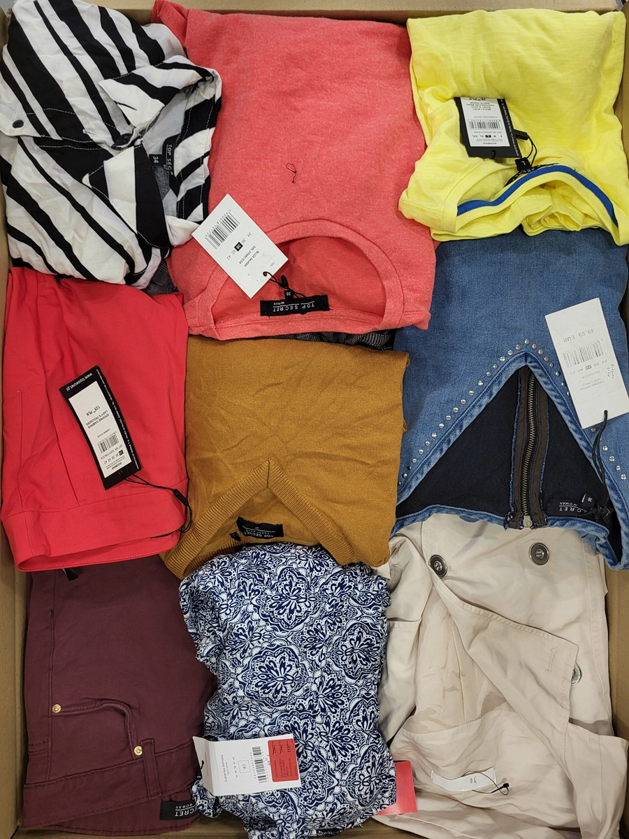 Category C package with significant signs of use or defects. The top layer shown is the contents of this package. The package contains approximately 75 pieces of which 80% are women’s clothing, 7% men’s clothing, 13% children’s clothing and accessories