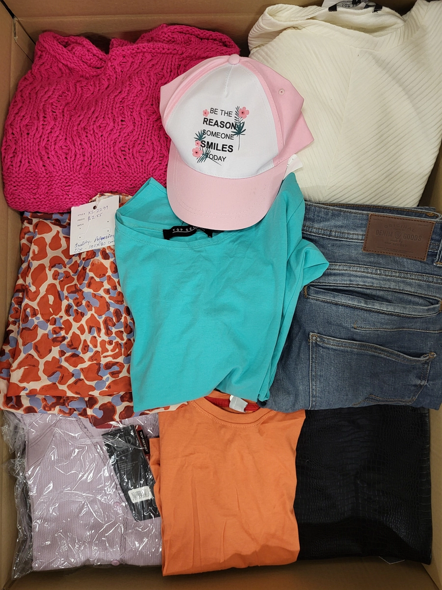 Category C package with significant signs of use or defects. The top layer shown is the contents of this package. The package contains approximately 75 pieces of which 80% are women’s clothing, 7% men’s clothing, 13% children’s clothing and accessories