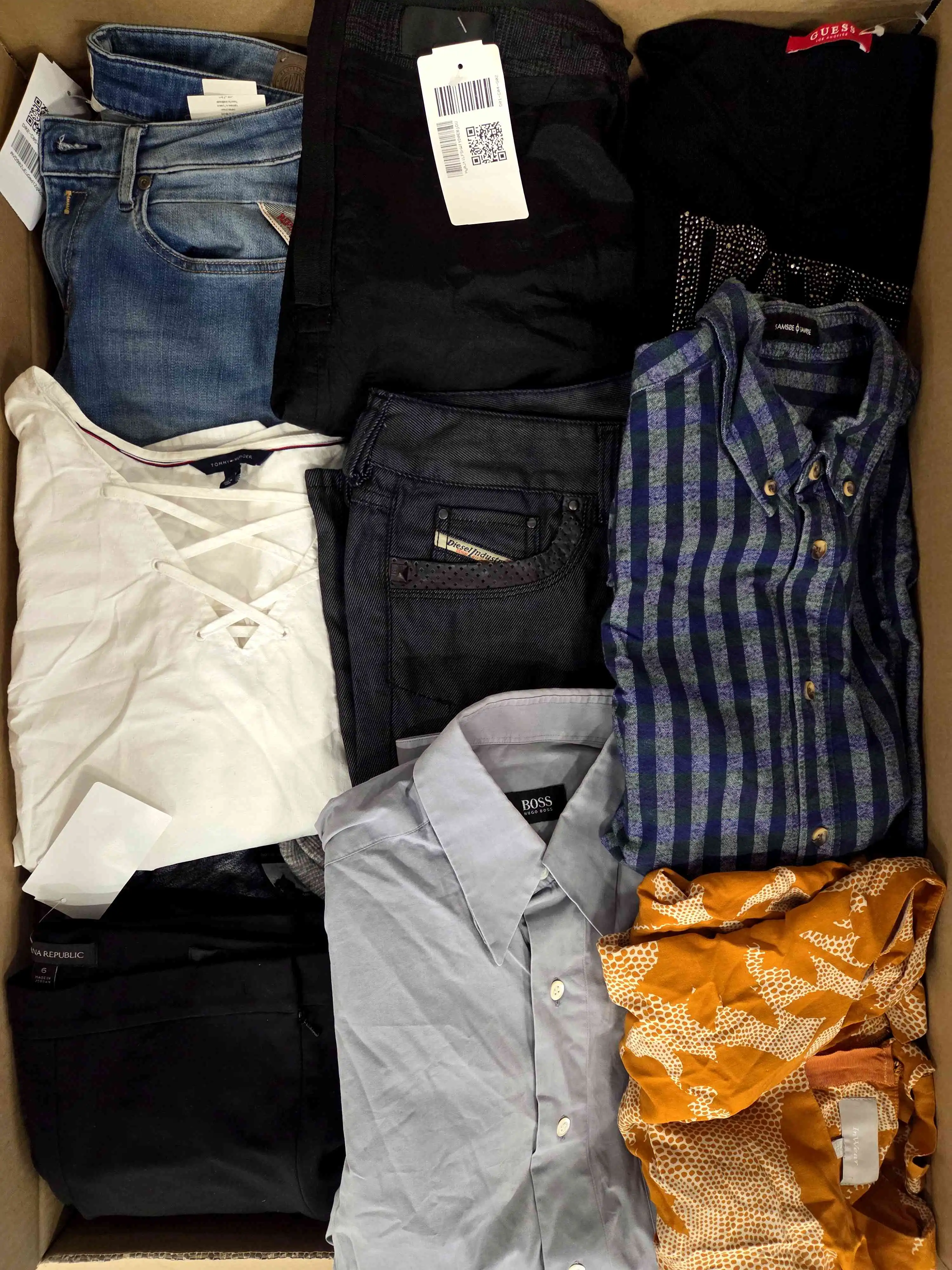 Each package is a varied mix of garments, including trousers, tops, sweaters, dresses, skirts, blazers, jackets, shirts, and vintage pieces, ready for resale. The clothing shows typical signs of wear, and in some cases, minor defects may be present, such as fading, small tears, missing buttons, or broken zippers.