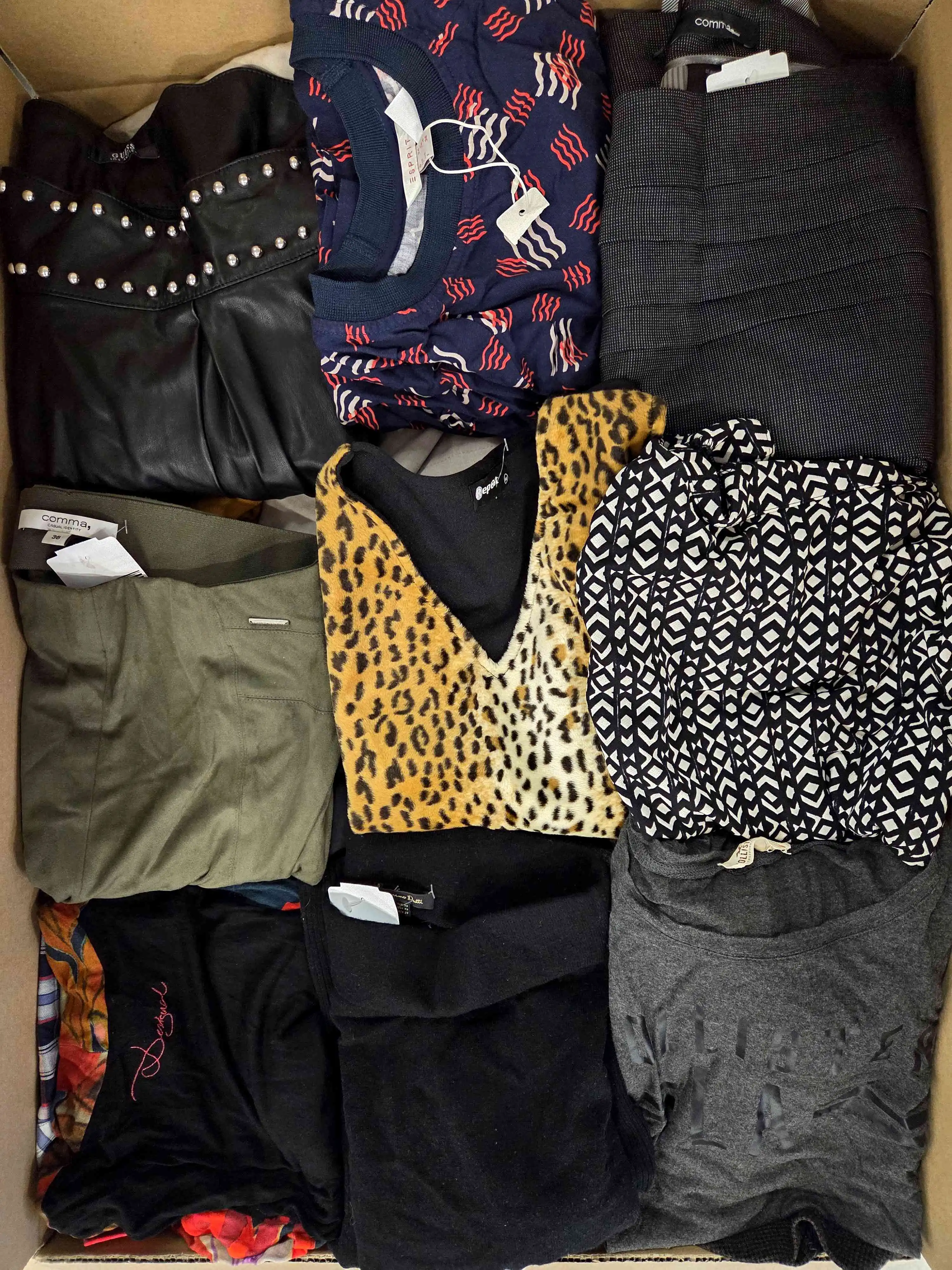 Each package is a varied mix of garments, including trousers, tops, sweaters, dresses, skirts, blazers, jackets, shirts, and vintage pieces, ready for resale. The clothing shows typical signs of wear, and in some cases, minor defects may be present, such as fading, small tears, missing buttons, or broken zippers.