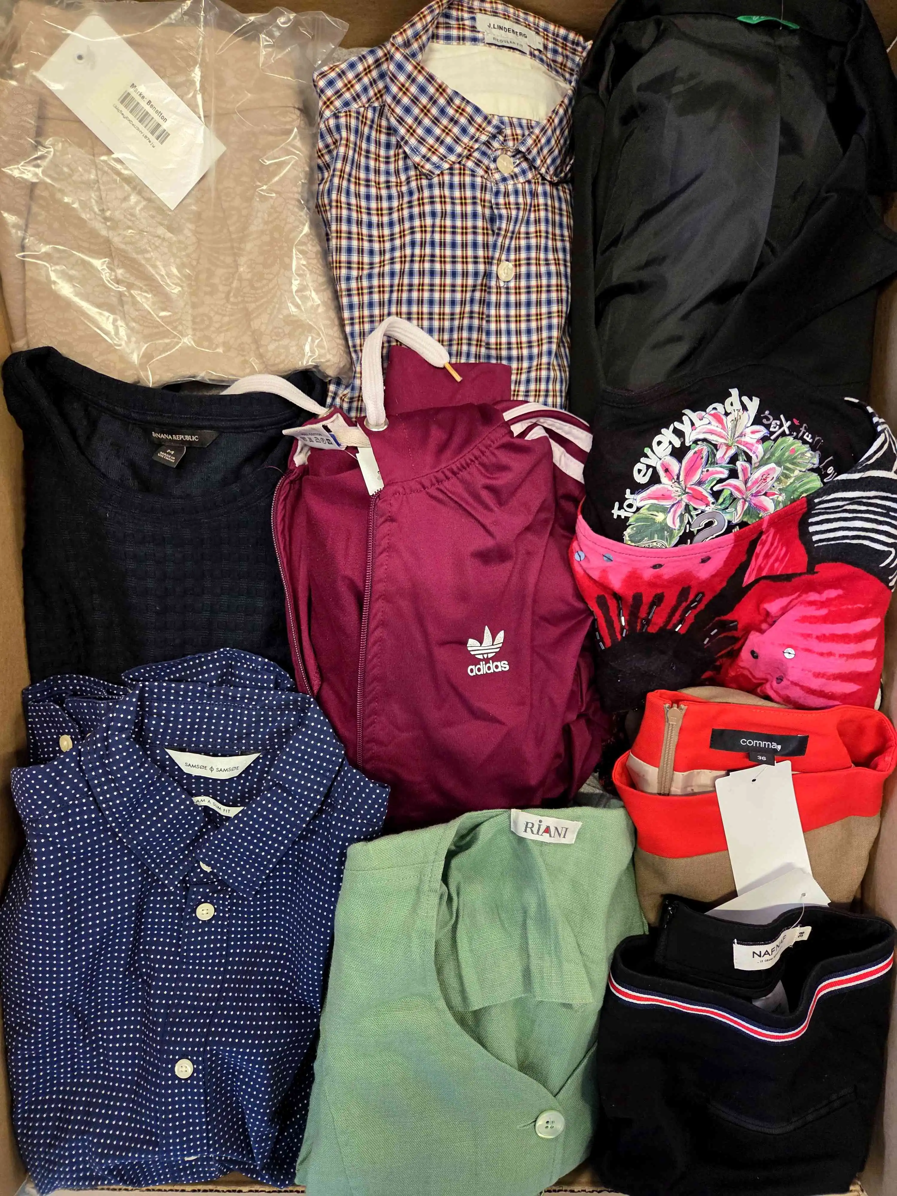 Each package is a varied mix of garments, including trousers, tops, sweaters, dresses, skirts, blazers, jackets, shirts, and vintage pieces, ready for resale. The clothing shows typical signs of wear, and in some cases, minor defects may be present, such as fading, small tears, missing buttons, or broken zippers.