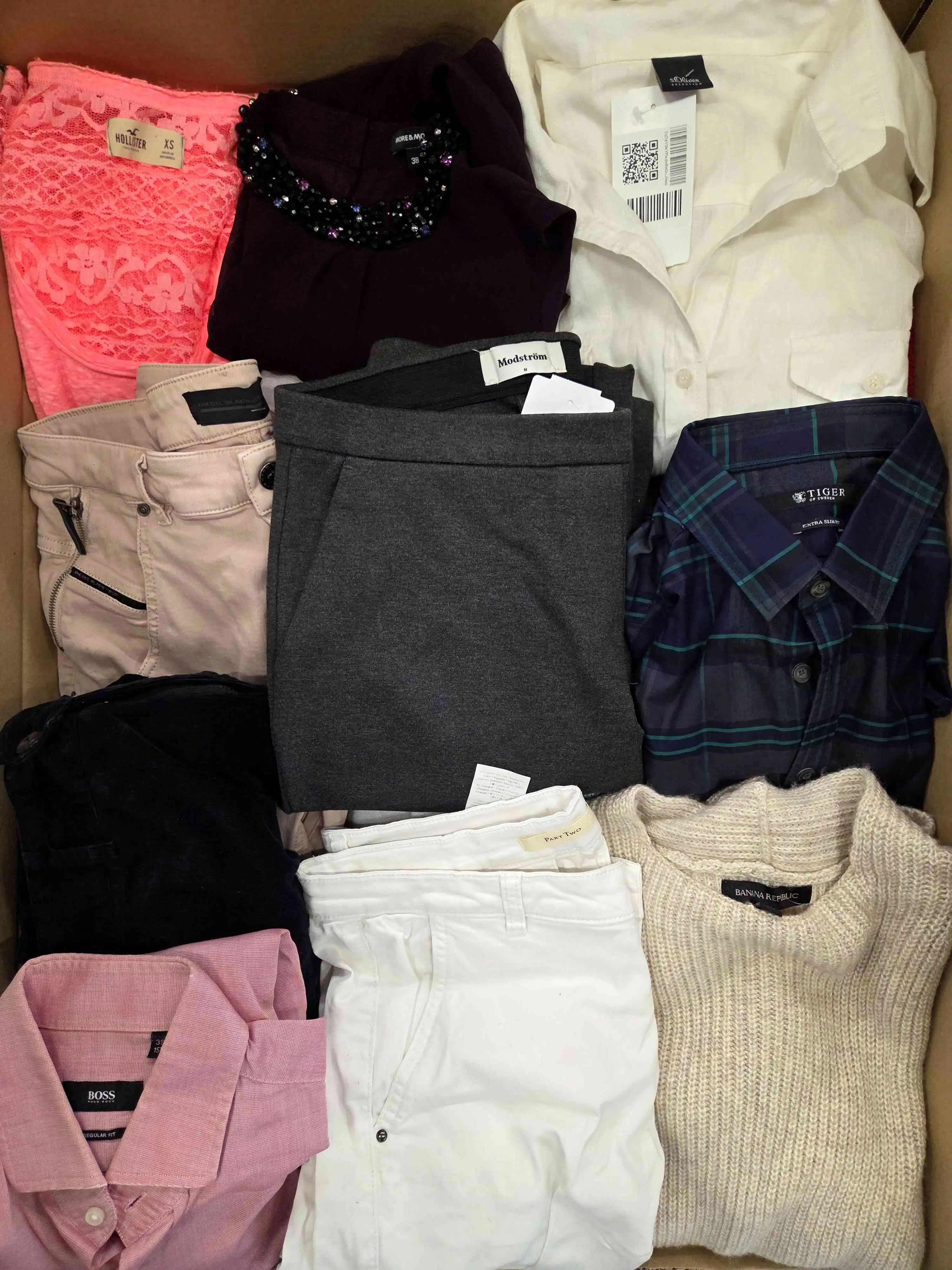 Each package is a varied mix of garments, including trousers, tops, sweaters, dresses, skirts, blazers, jackets, shirts, and vintage pieces, ready for resale. The clothing shows typical signs of wear, and in some cases, minor defects may be present, such as fading, small tears, missing buttons, or broken zippers.