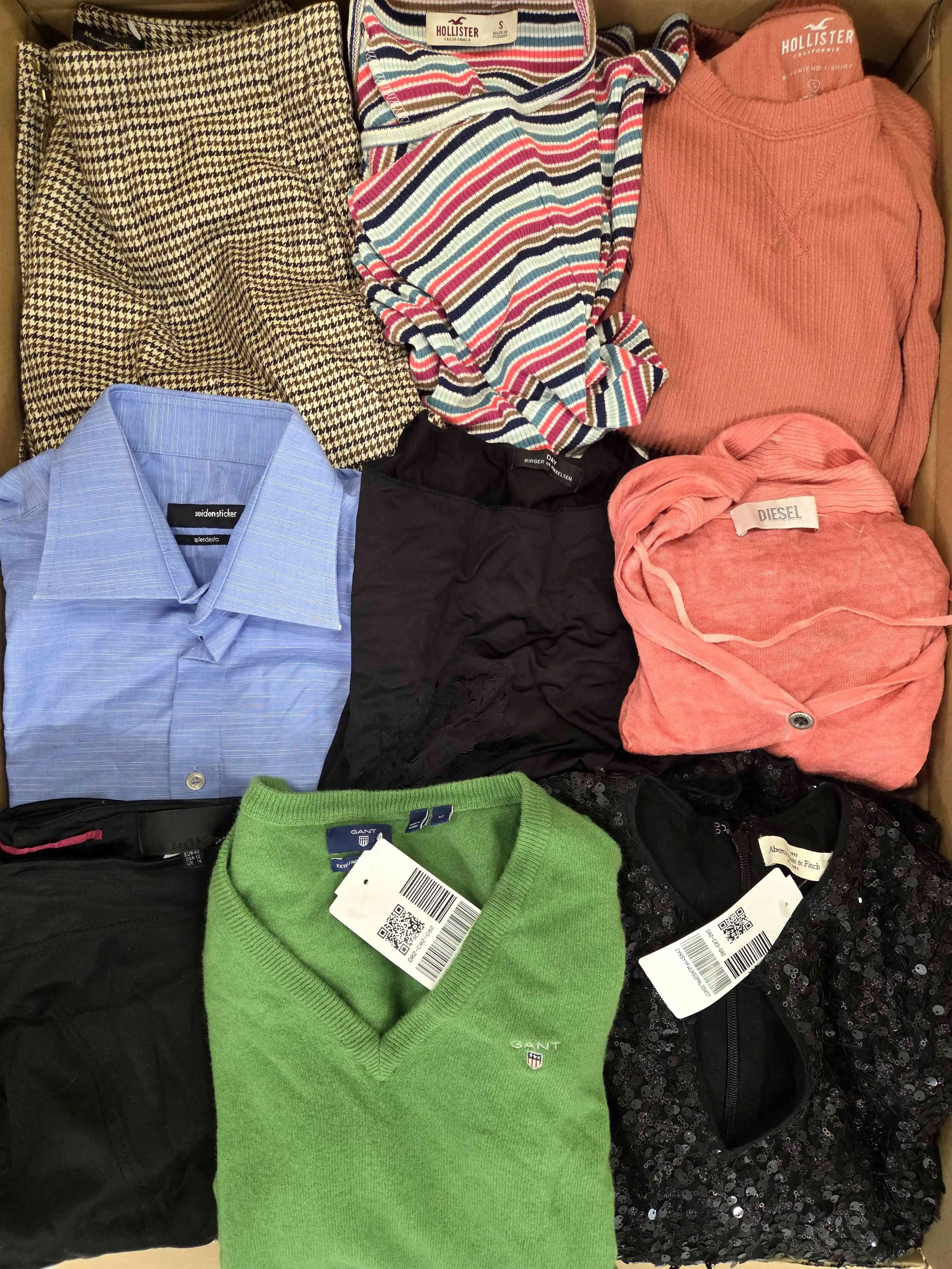 Each package is a varied mix of garments, including trousers, tops, sweaters, dresses, skirts, blazers, jackets, shirts, and vintage pieces, ready for resale. The clothing shows typical signs of wear, and in some cases, minor defects may be present, such as fading, small tears, missing buttons, or broken zippers.