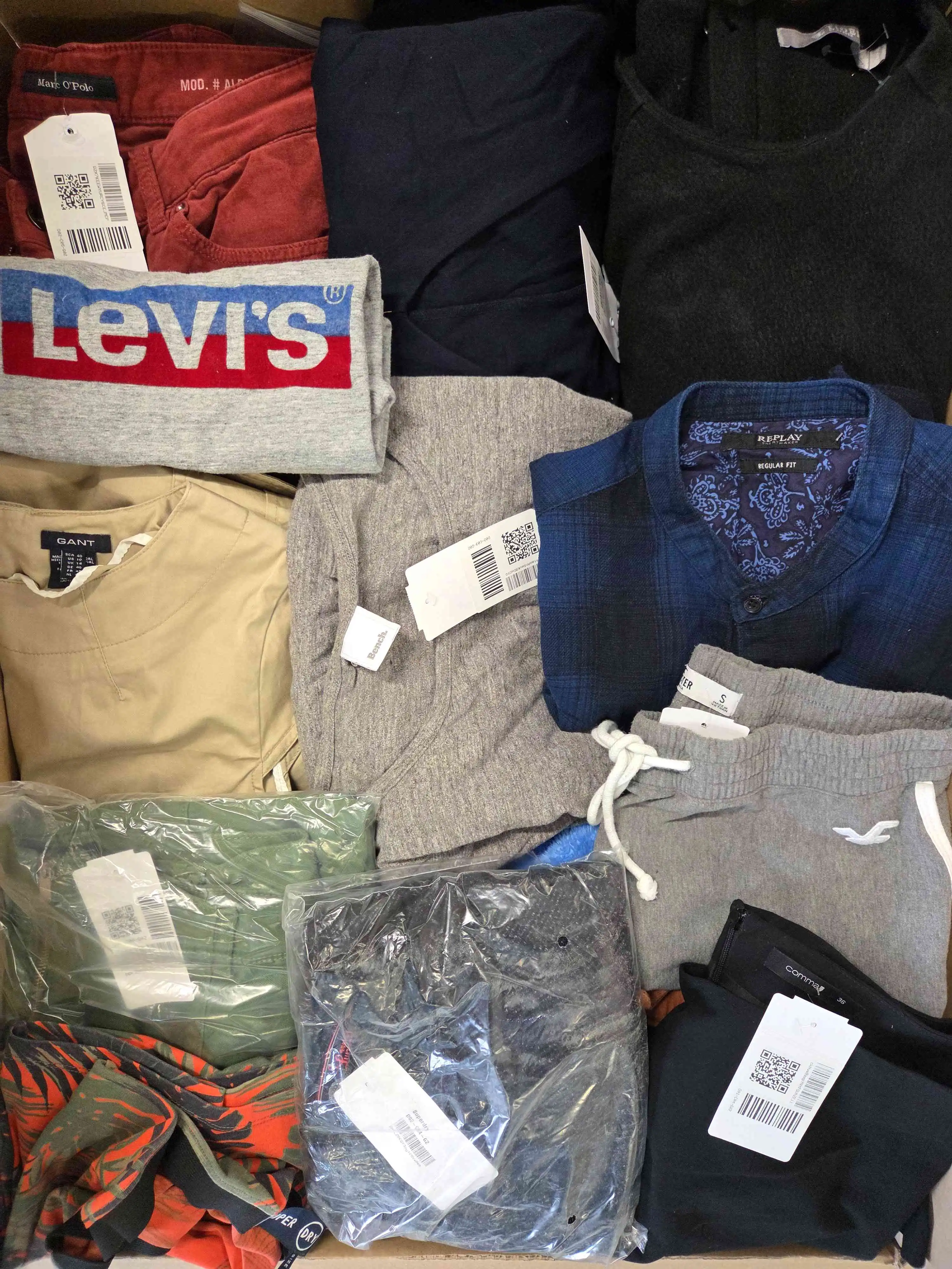 Each package is a varied mix of garments, including trousers, tops, sweaters, dresses, skirts, blazers, jackets, shirts, and vintage pieces, ready for resale. The clothing shows typical signs of wear, and in some cases, minor defects may be present, such as fading, small tears, missing buttons, or broken zippers.