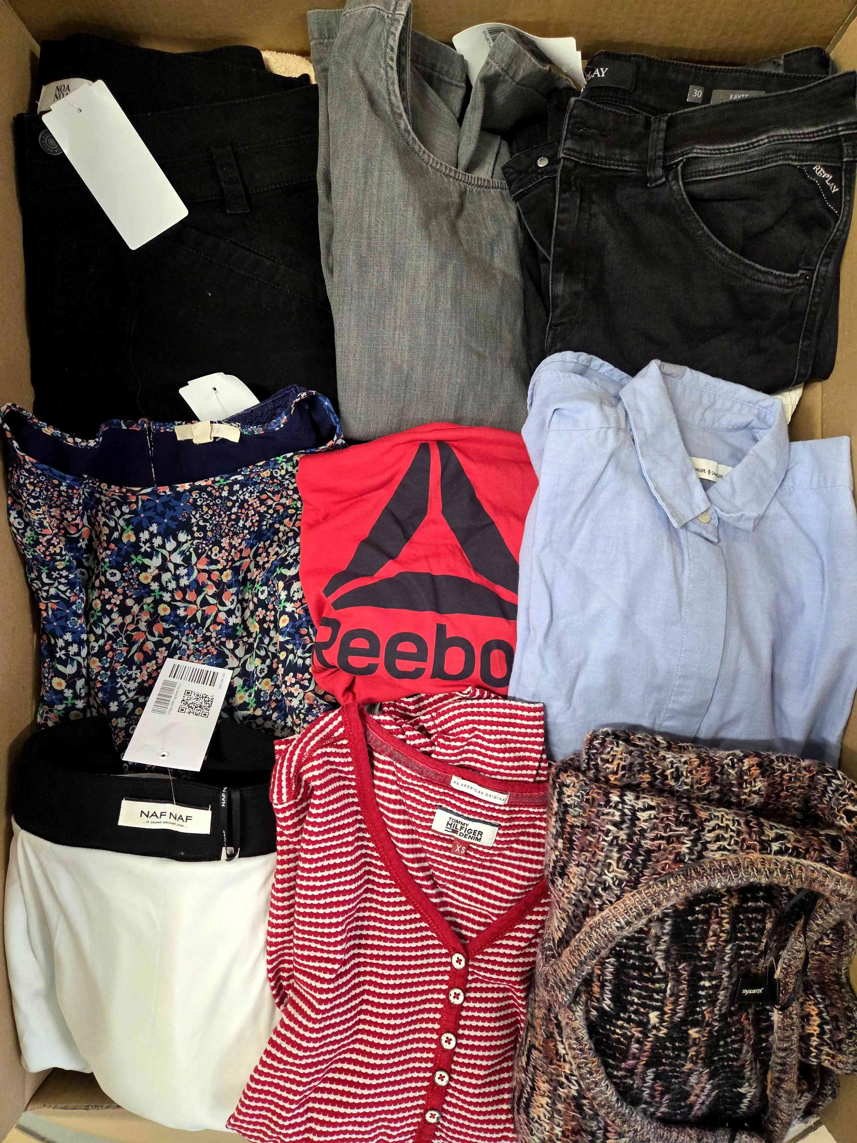 Each package is a varied mix of garments, including trousers, tops, sweaters, dresses, skirts, blazers, jackets, shirts, and vintage pieces, ready for resale. The clothing shows typical signs of wear, and in some cases, minor defects may be present, such as fading, small tears, missing buttons, or broken zippers.