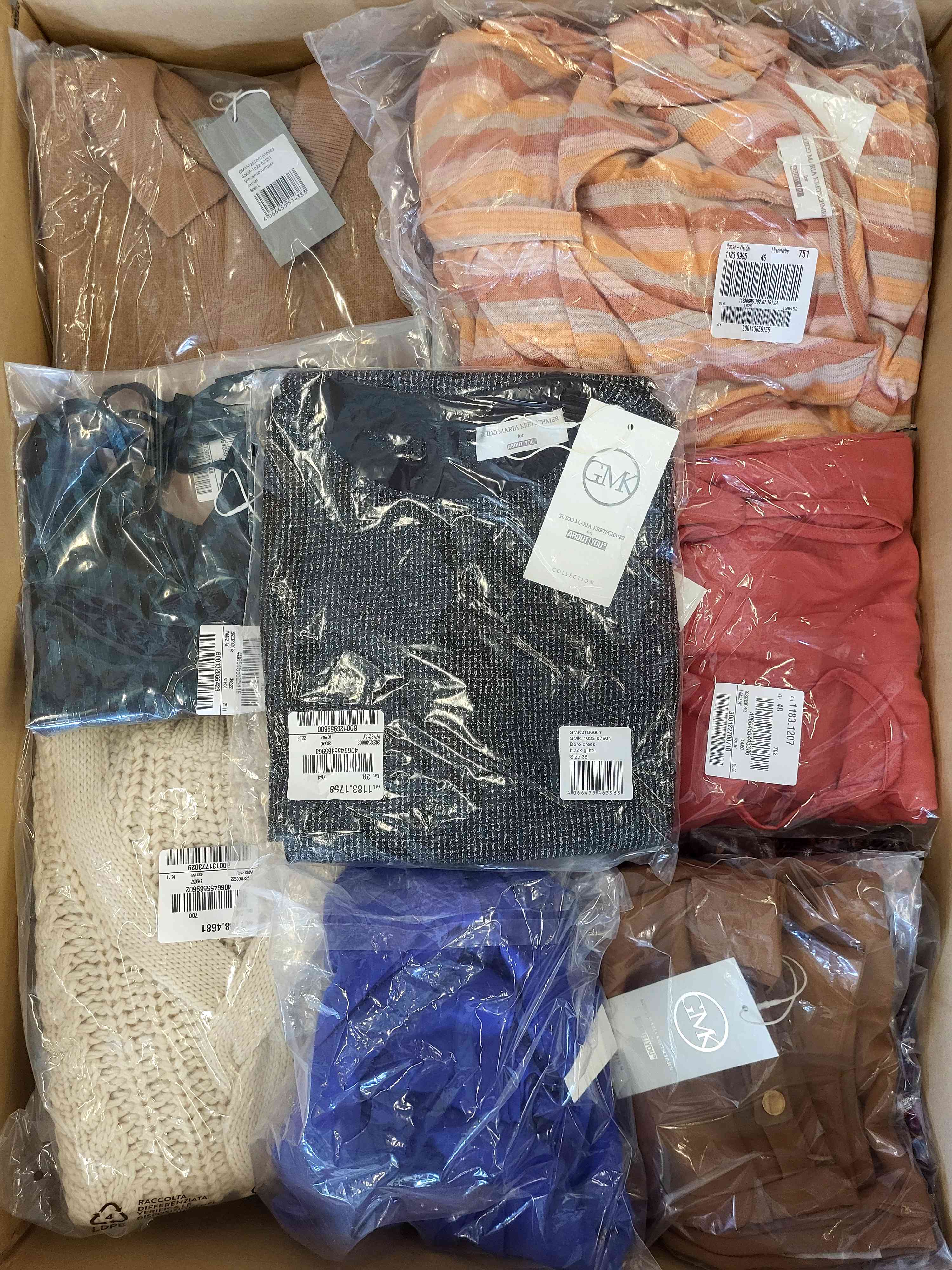 The package includes approximately 30 items of women’s clothing, including jackets, coats, jumpers, blouses, trousers, dresses, blouses, tops, belts, bags, socks. There are also men clothing in packages.