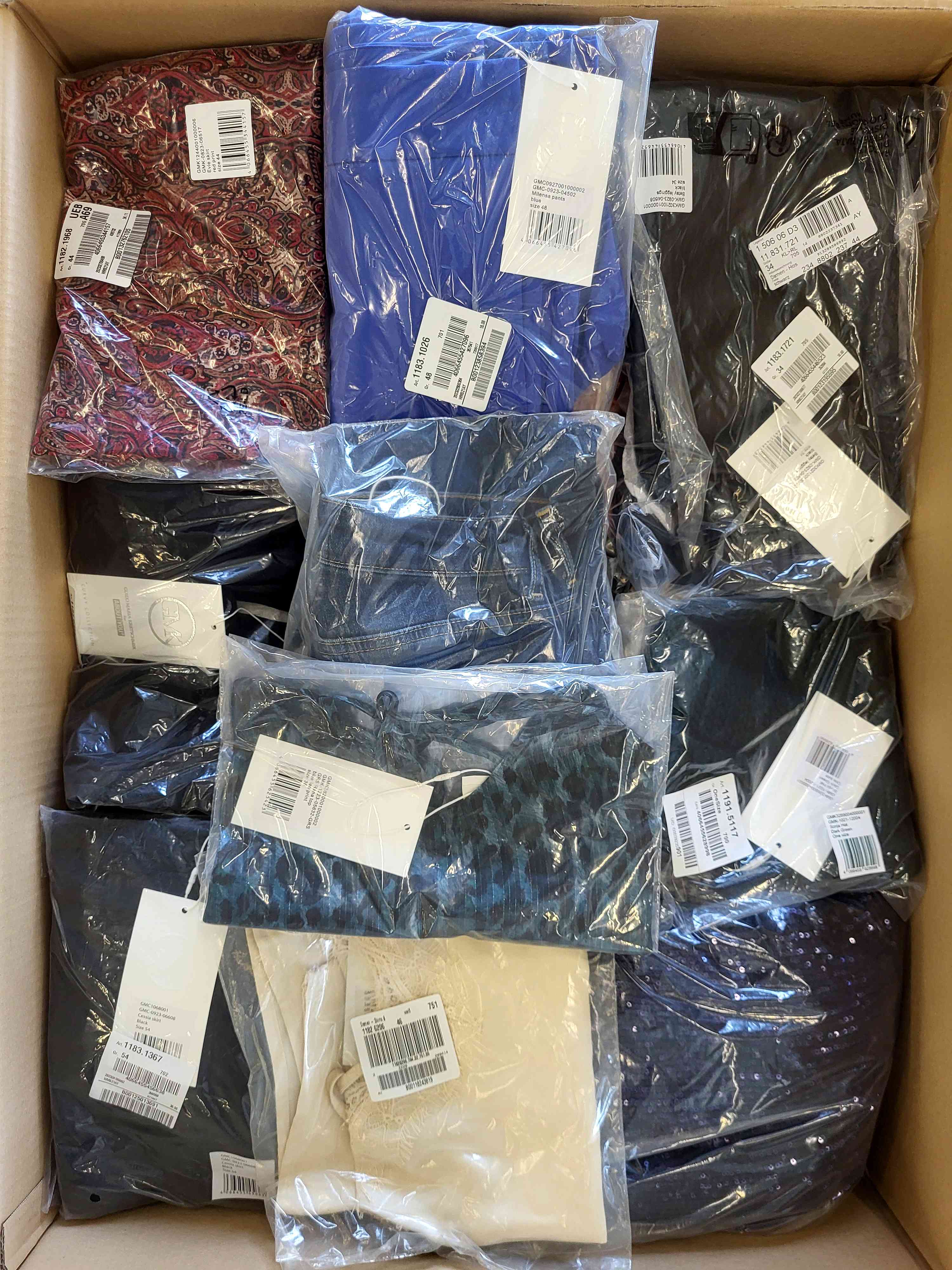 The package includes approximately 30 items of women’s clothing, including jackets, coats, jumpers, blouses, trousers, dresses, blouses, tops, belts, bags, socks. There are also men clothing in packages.