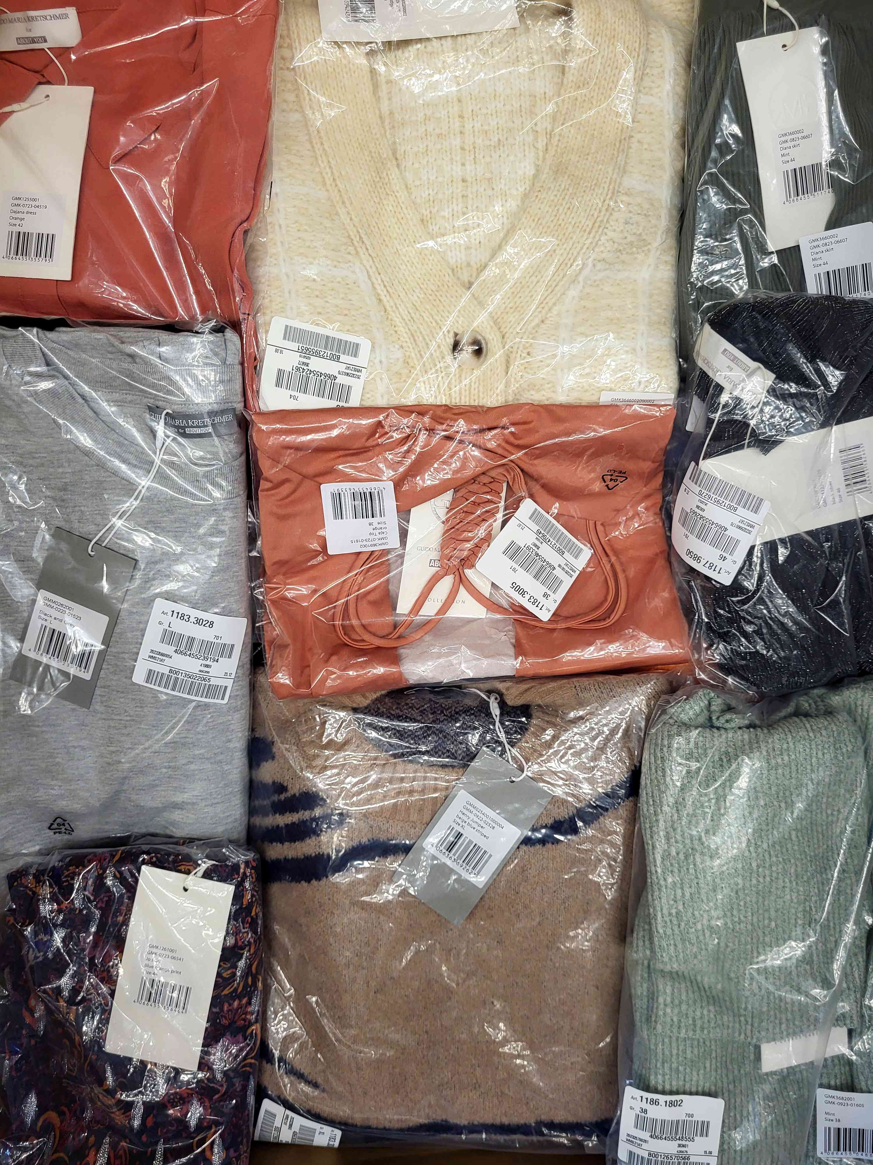 The package includes approximately 30 items of women’s clothing, including jackets, coats, jumpers, blouses, trousers, dresses, blouses, tops, belts, bags, socks. There are also men clothing in packages.